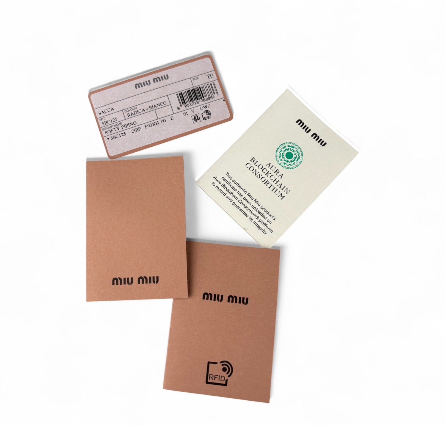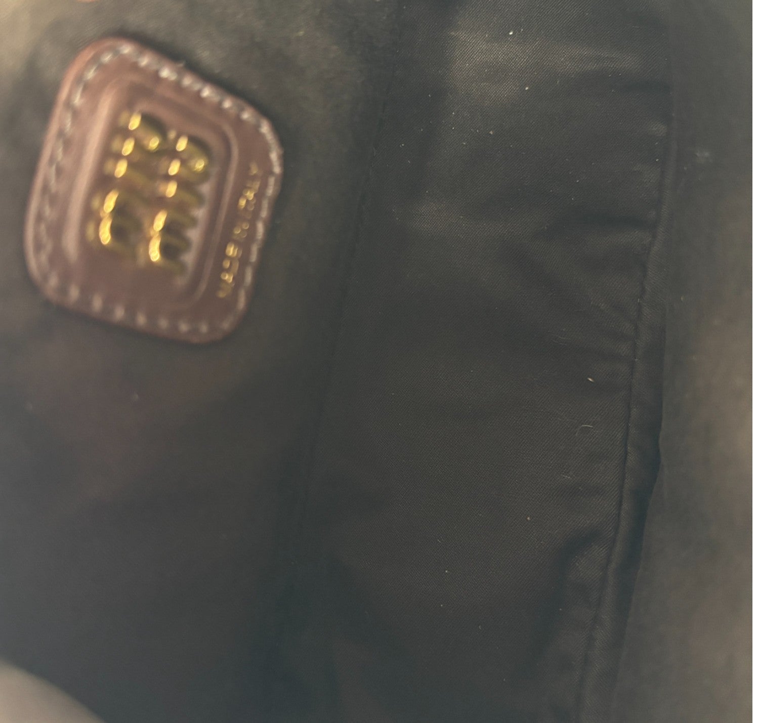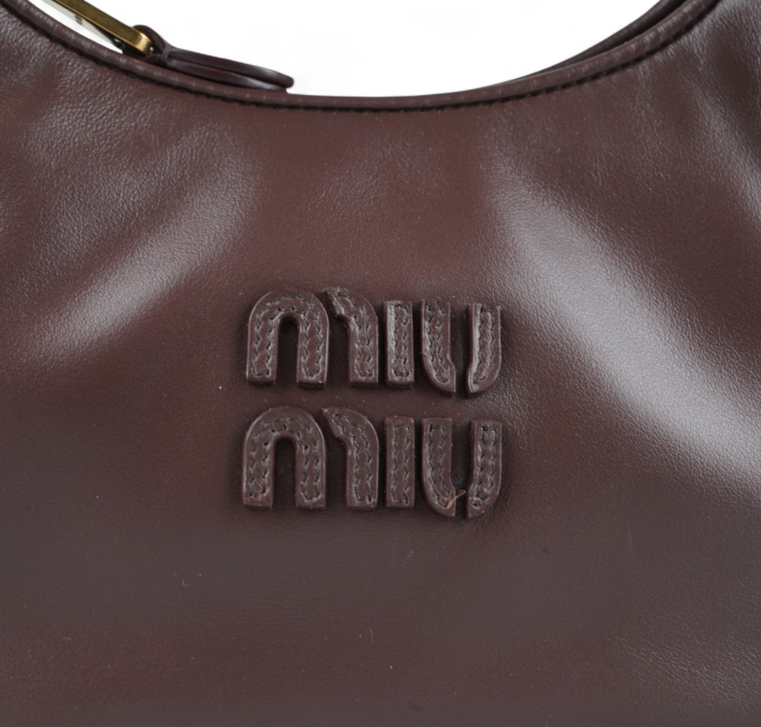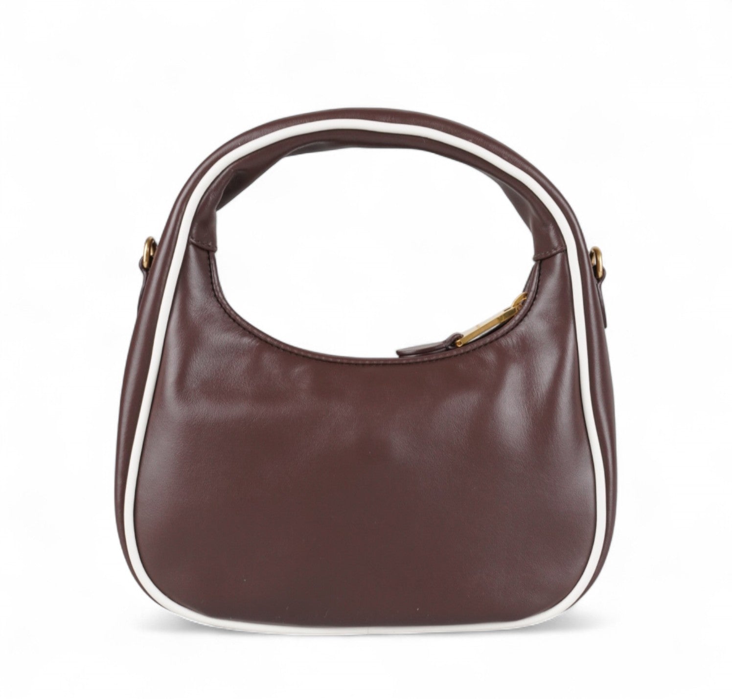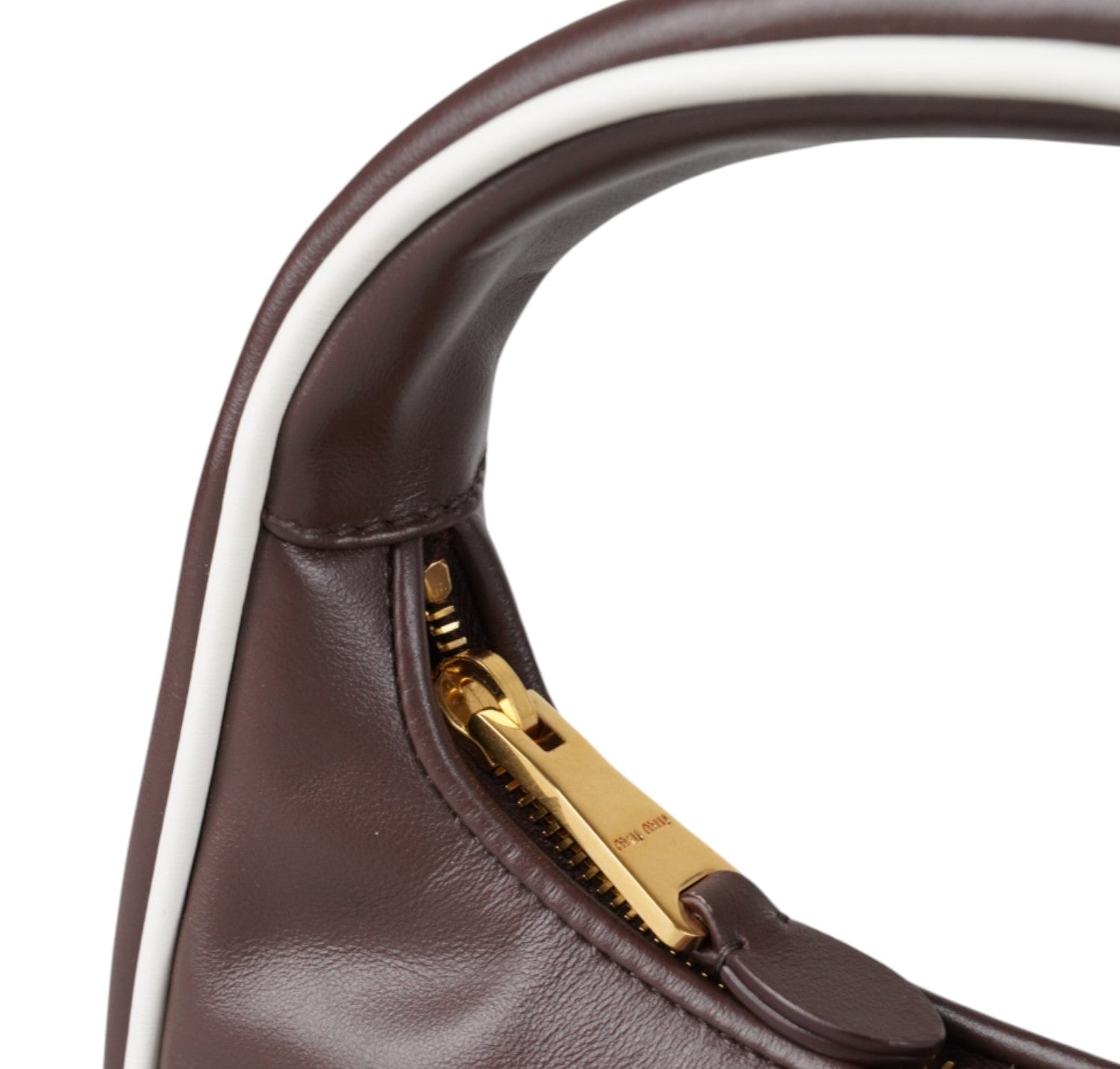Borsa Miu Miu, modello Wander, misura Small, realizzata in pelle Liscia Marrone Cioccolato con profili bianchi a contrasto. Silhouette morbida e dallo stile sporty-chic. Portabilità a mano o a spalla grazie alla tracolla coordinata. Logo Miu Miu frontale in Pelle tono su tono. Interno foderato in tessuto. Chiusura superiore con zip. Condizioni pari al nuovo. Potrebbe presentare minimi segni di stoccaggio.