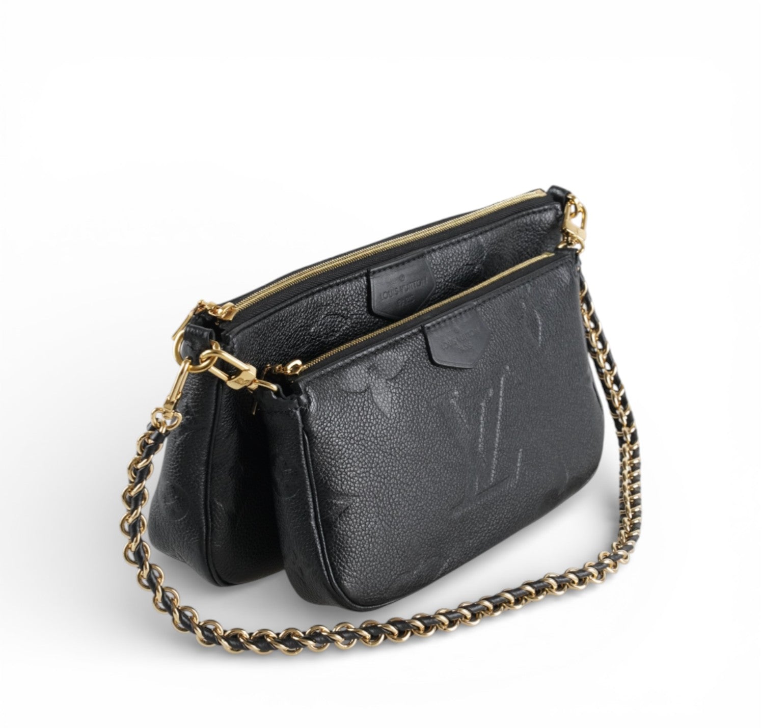 Borsa Louis Vuitton, modello Multi Pochette Accessoires, realizzata in Pelle Monogram Empreinte Nera con Metalleria Oro. Chiusura superiore con cerniera. Composta da due pochette e doppia tracolla in pelle regolabile e in catena dorata per doppia portabilità, a spalla o crossbody. Ideale per un look day-to-night. Interno foderato in microfibra. Condizioni eccellenti, minimi segni d'uso. Microchip interno.