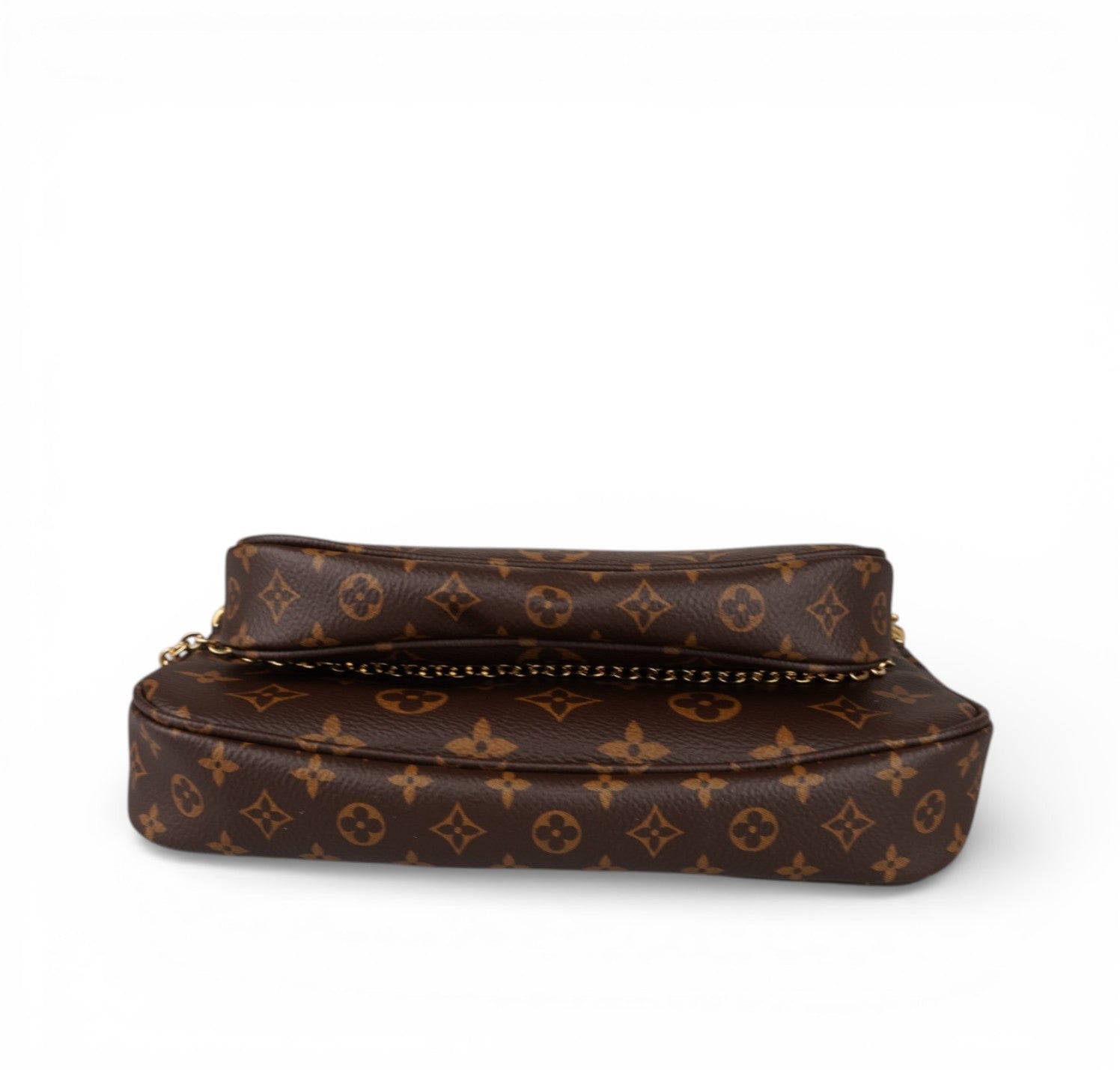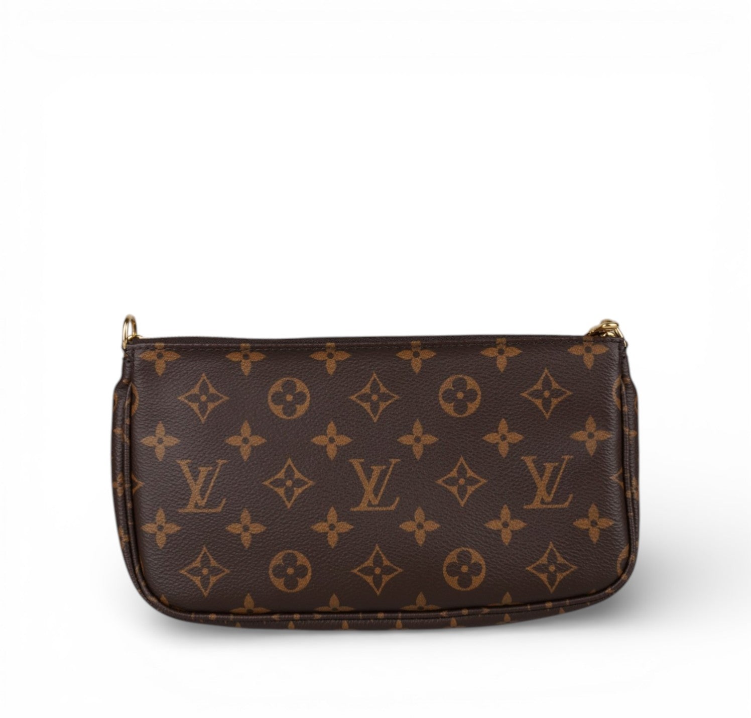 Borsa Louis Vuitton, modello Multi Pochette, realizzate in Tela Monogram. Finiture in Vacchetta Naturale. Parti metalliche in Ottone Dorato. Comprende i tre best seller della Maison in un unica borsa: Portamonete rotondo con zip, Mini Pochette e Pochette Accessoires. Dotata di tracolla amovibile e regolabile per il trasporto a spalla o crossbody. Catenella a spalla in metallo per poter utilizzare singolarmente le pochette. Normali segni d'uso generali. Micro graffi metalleria. Condizioni eccellenti.