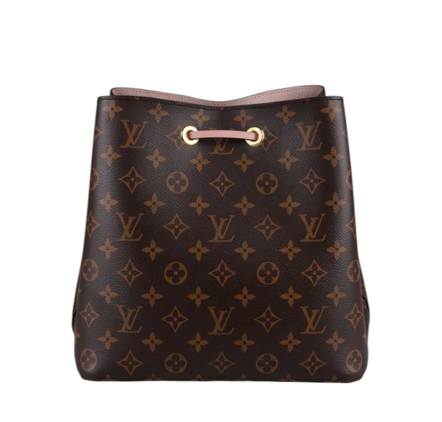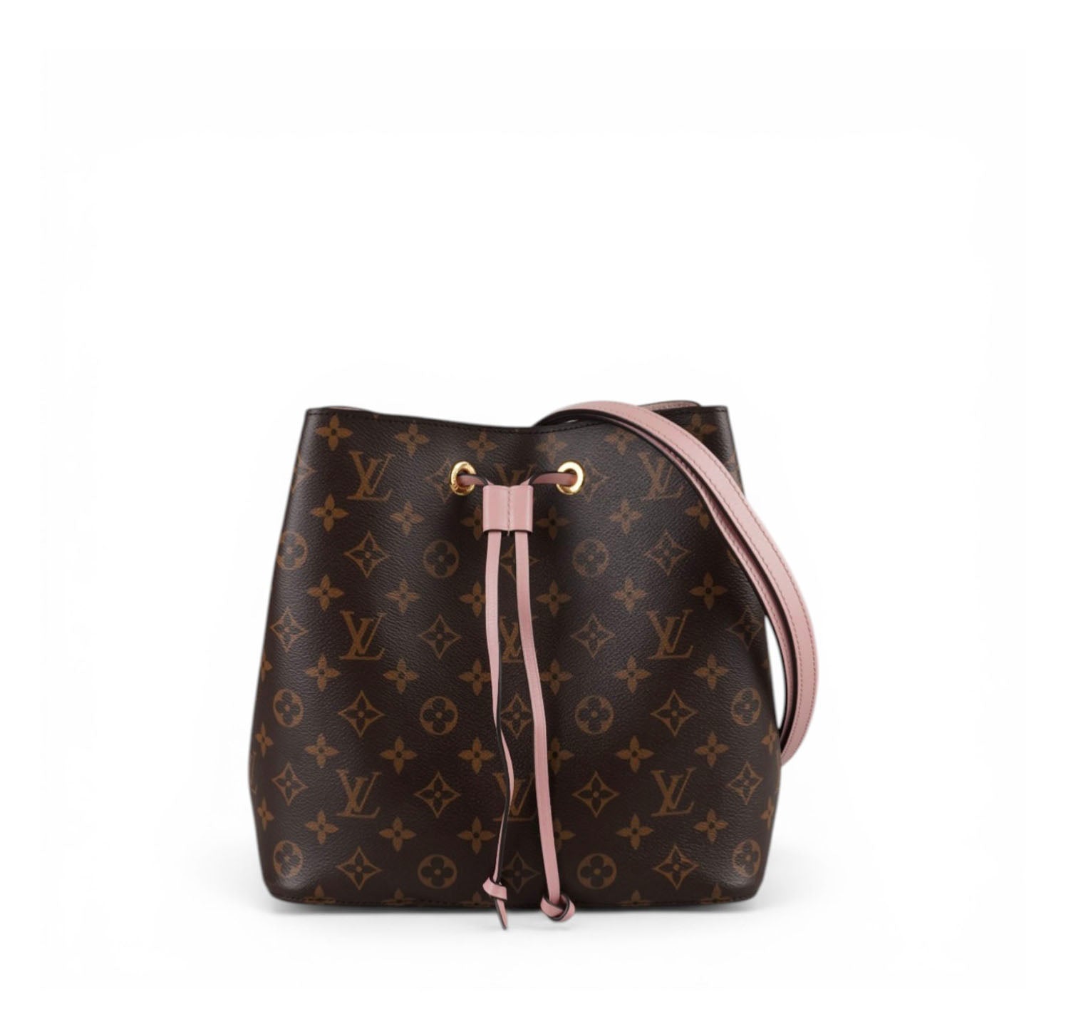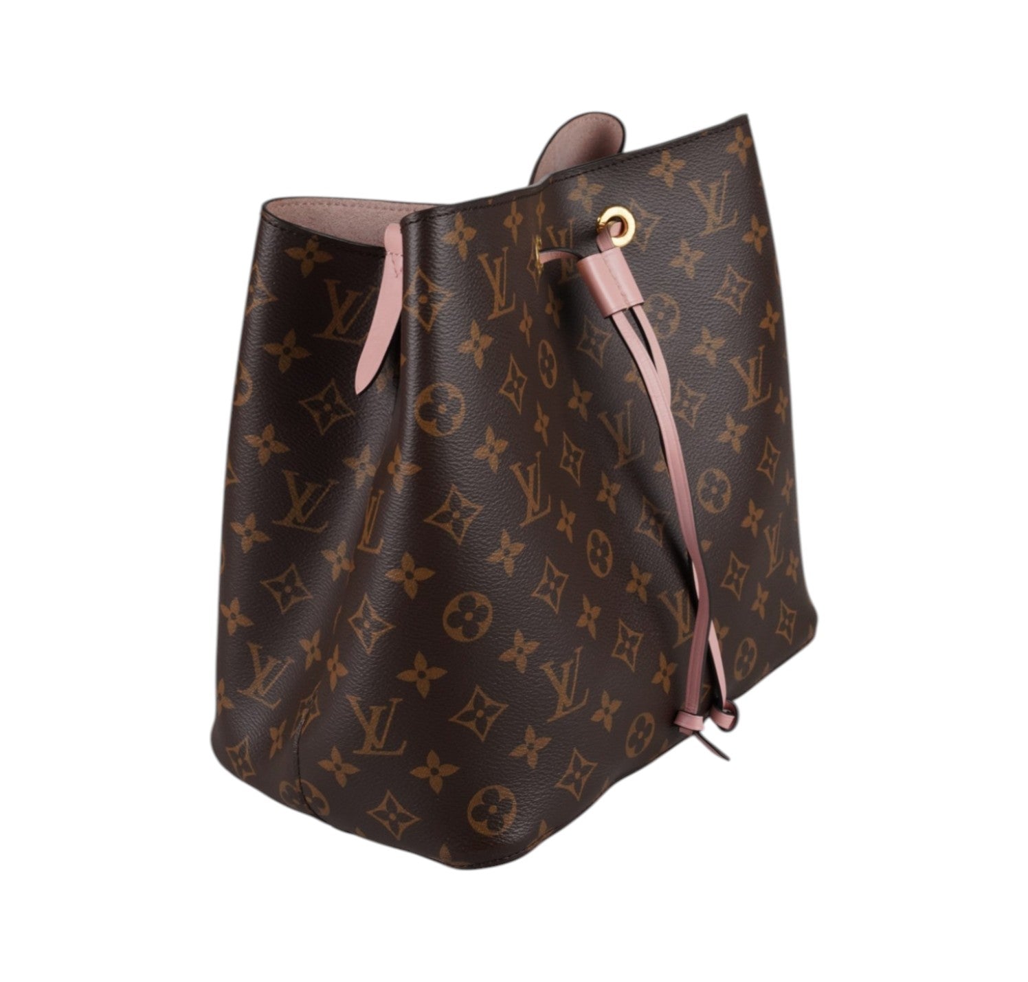 Secchiello Louis Vuitton, modello NéoNoé, realizzato in Tela Monogram. Finiture in Pelle Rosa Rose Poudré. Metalleria in Ottone Dorato. Fodera interna in microfibra Rosa, suddivisa in due scomparti da una tasca centrale piatta con zip. Chiusura superiore con coulisse. Munito di tracolla amovibile e regolabile per personalizzarne l'utilizzo. Si presenta in ottimo stato generale, con lievi segni del tempo in alcuni punti. Minimi micrograffi su tela, pelle, metalleria.