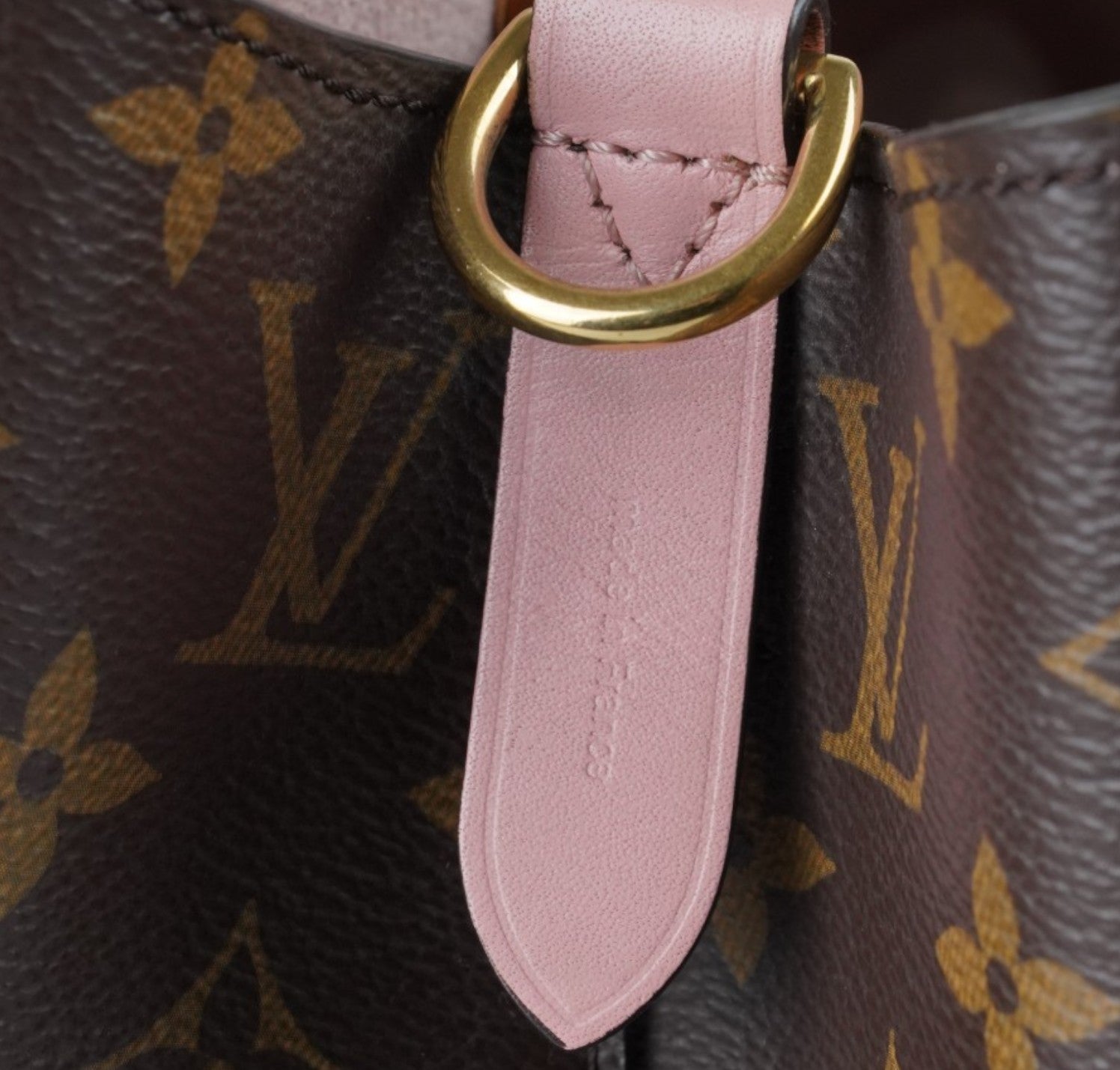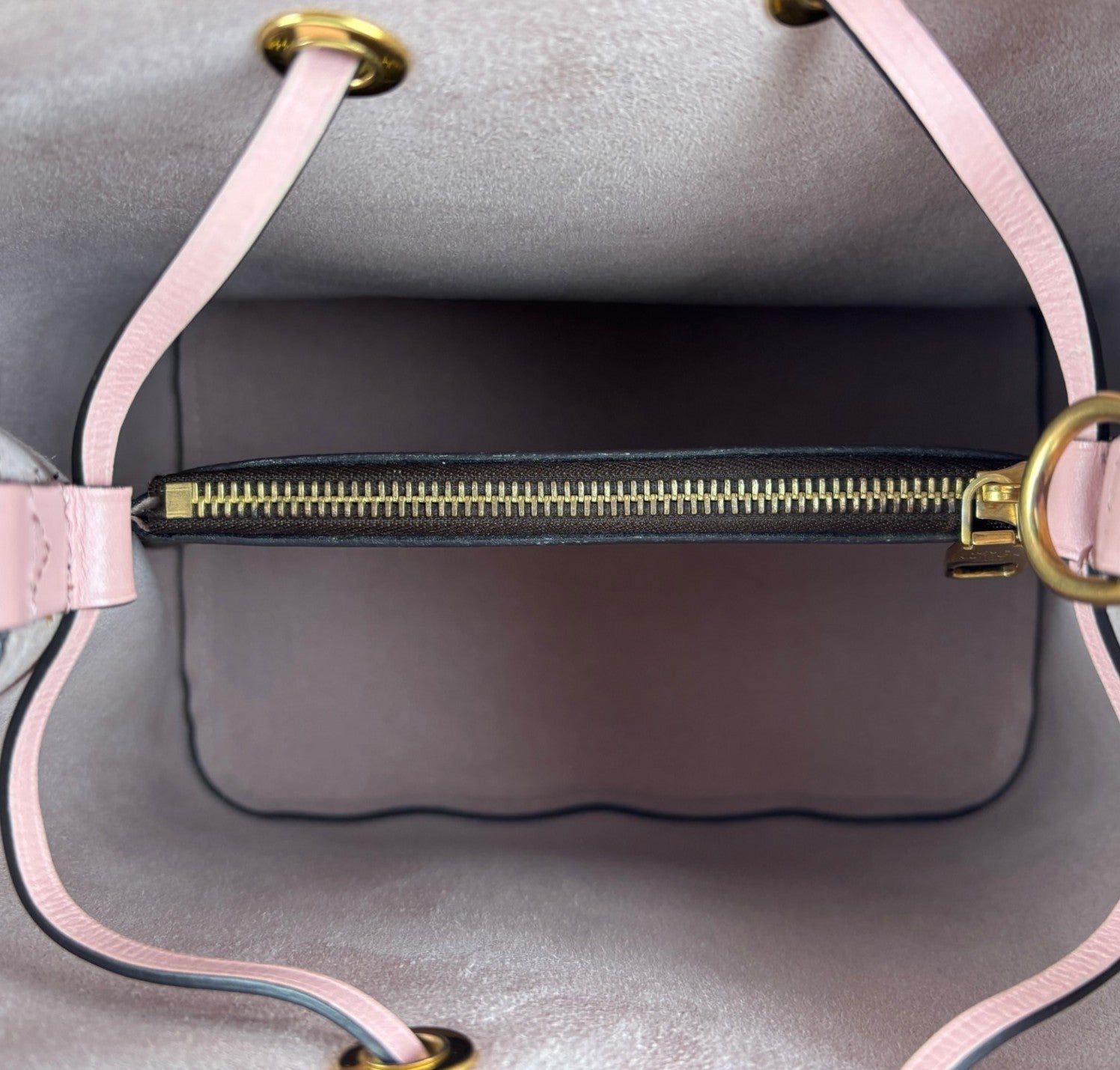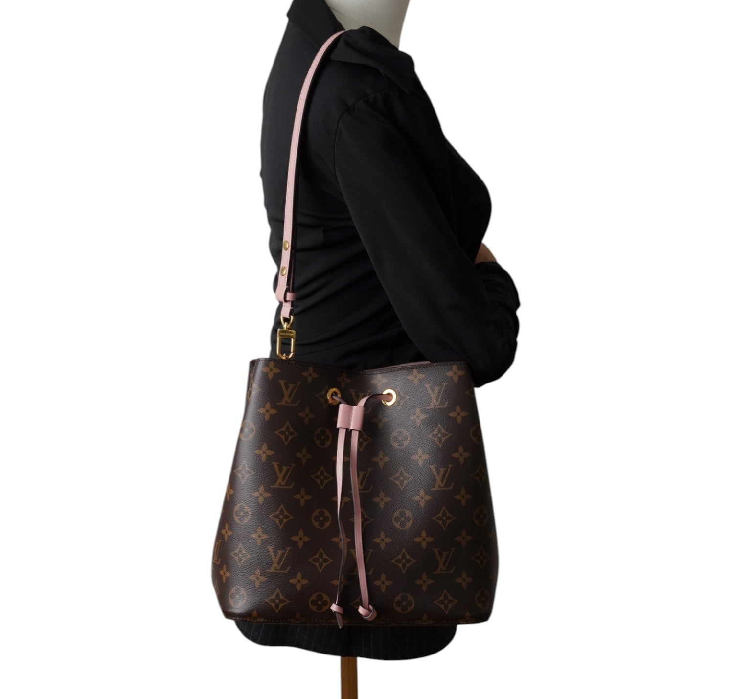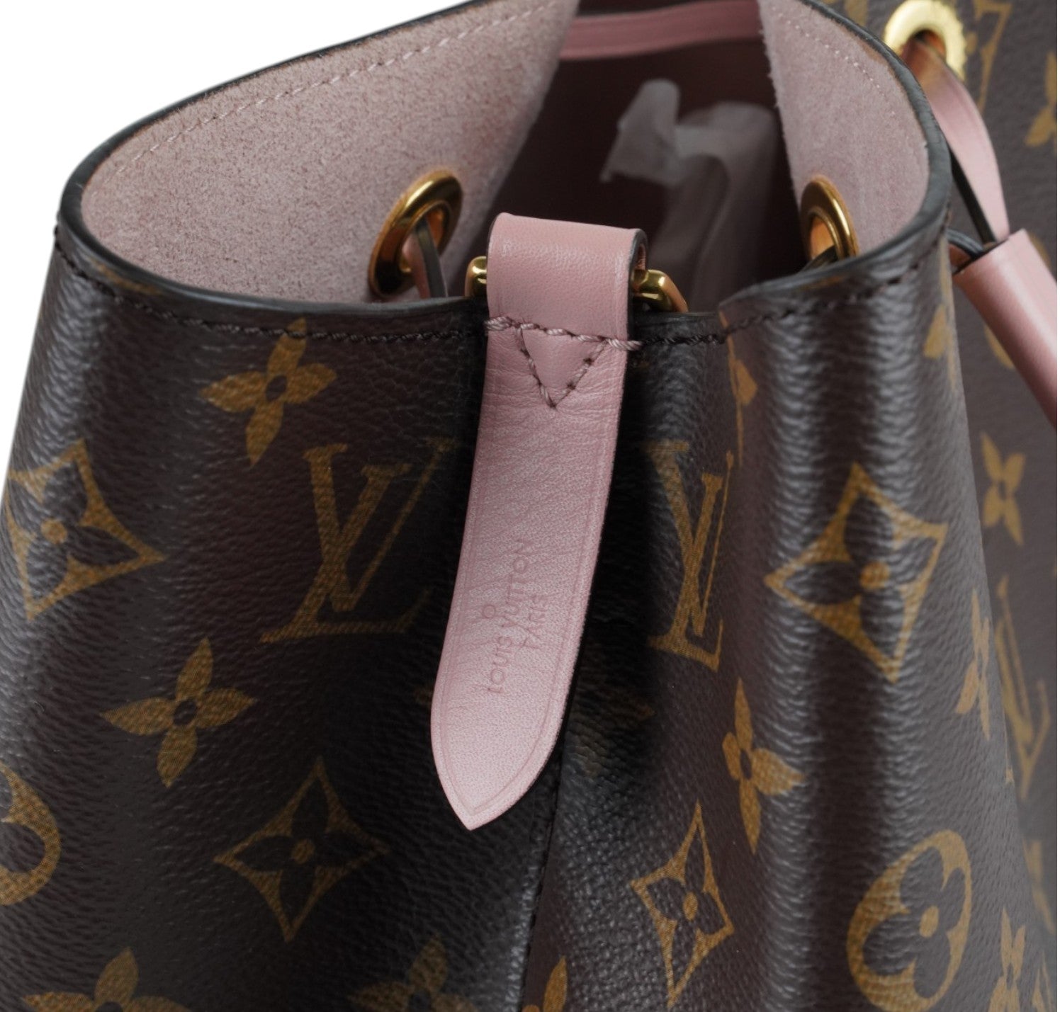 Secchiello Louis Vuitton, modello NéoNoé, realizzato in Tela Monogram. Finiture in Pelle Rosa Rose Poudré. Metalleria in Ottone Dorato. Fodera interna in microfibra Rosa, suddivisa in due scomparti da una tasca centrale piatta con zip. Chiusura superiore con coulisse. Munito di tracolla amovibile e regolabile per personalizzarne l'utilizzo. Si presenta in ottimo stato generale, con lievi segni del tempo in alcuni punti. Minimi micrograffi su tela, pelle, metalleria.