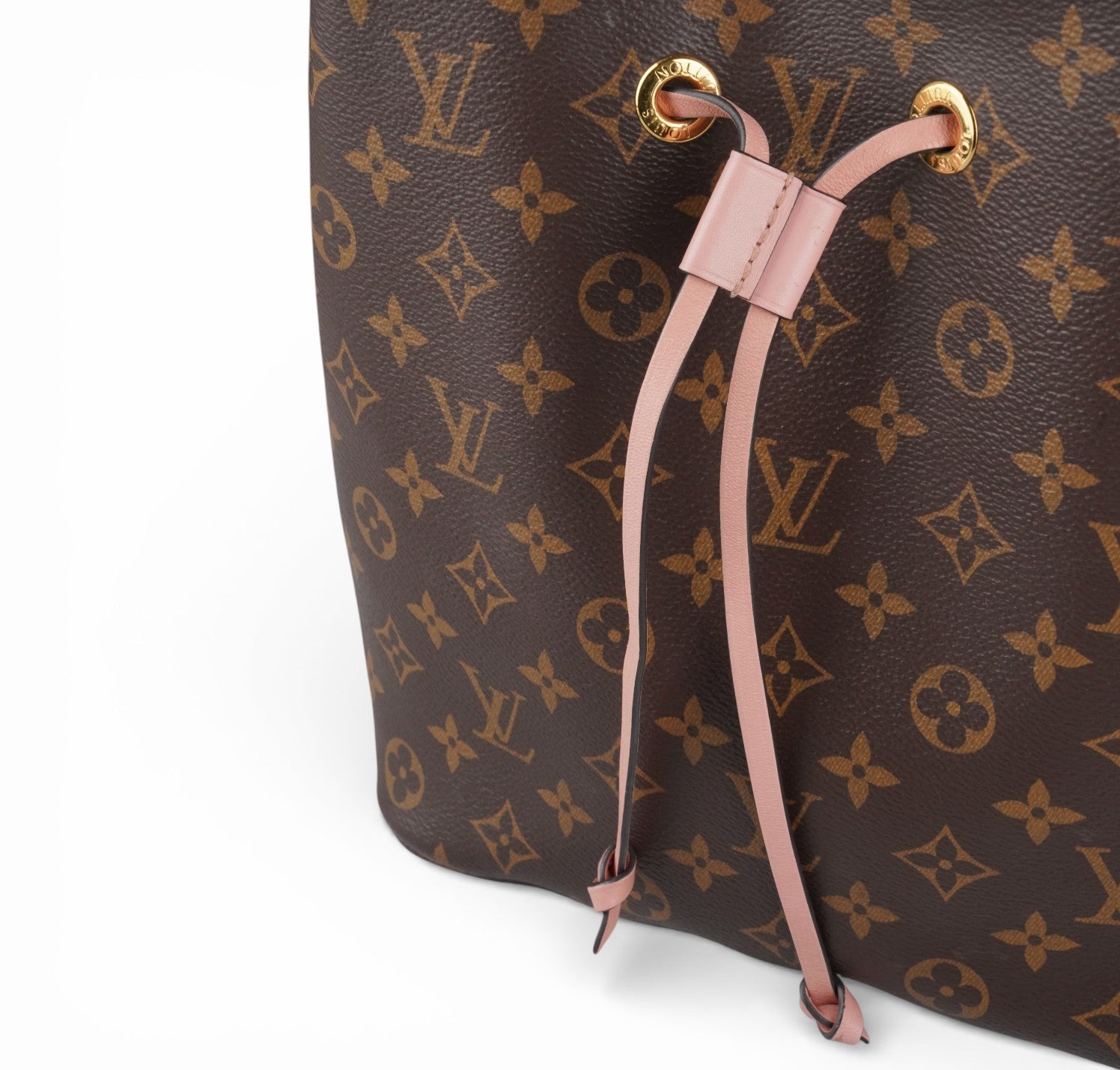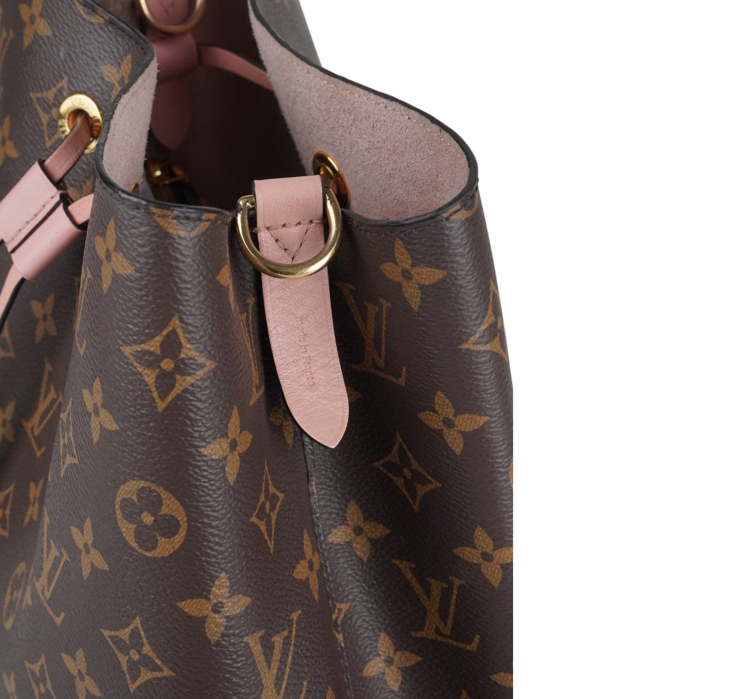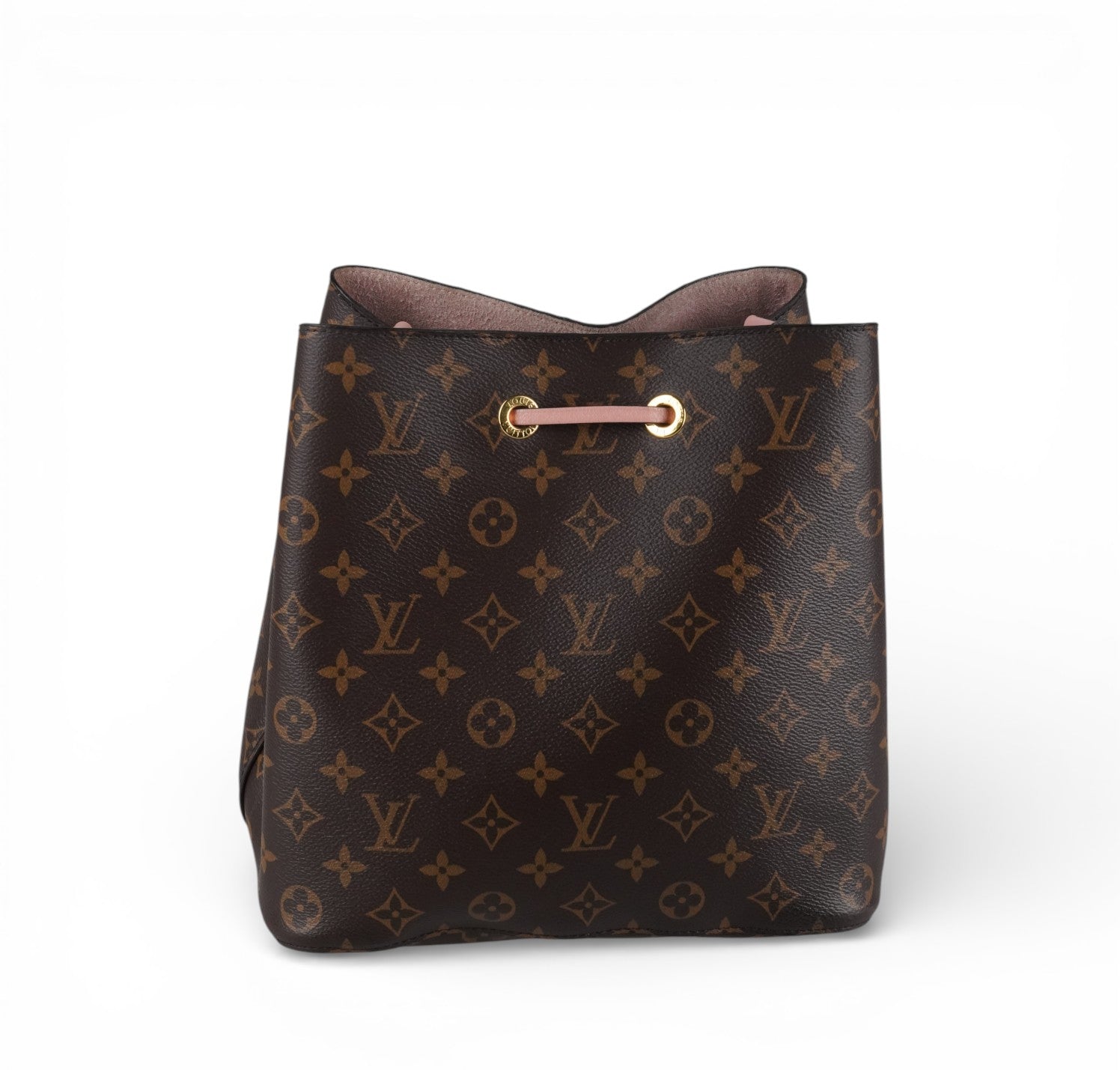 Secchiello Louis Vuitton, modello NéoNoé, realizzato in Tela Monogram. Finiture in Pelle Rosa Rose Poudré. Metalleria in Ottone Dorato. Fodera interna in microfibra Rosa, suddivisa in due scomparti da una tasca centrale piatta con zip. Chiusura superiore con coulisse. Munito di tracolla amovibile e regolabile per personalizzarne l'utilizzo. Si presenta in ottimo stato generale, con lievi segni del tempo in alcuni punti. Minimi micrograffi su tela, pelle. Minimi segni di sfregamento su tessuto interno dovuti al normale utilizzo (parte alta di chiusura).