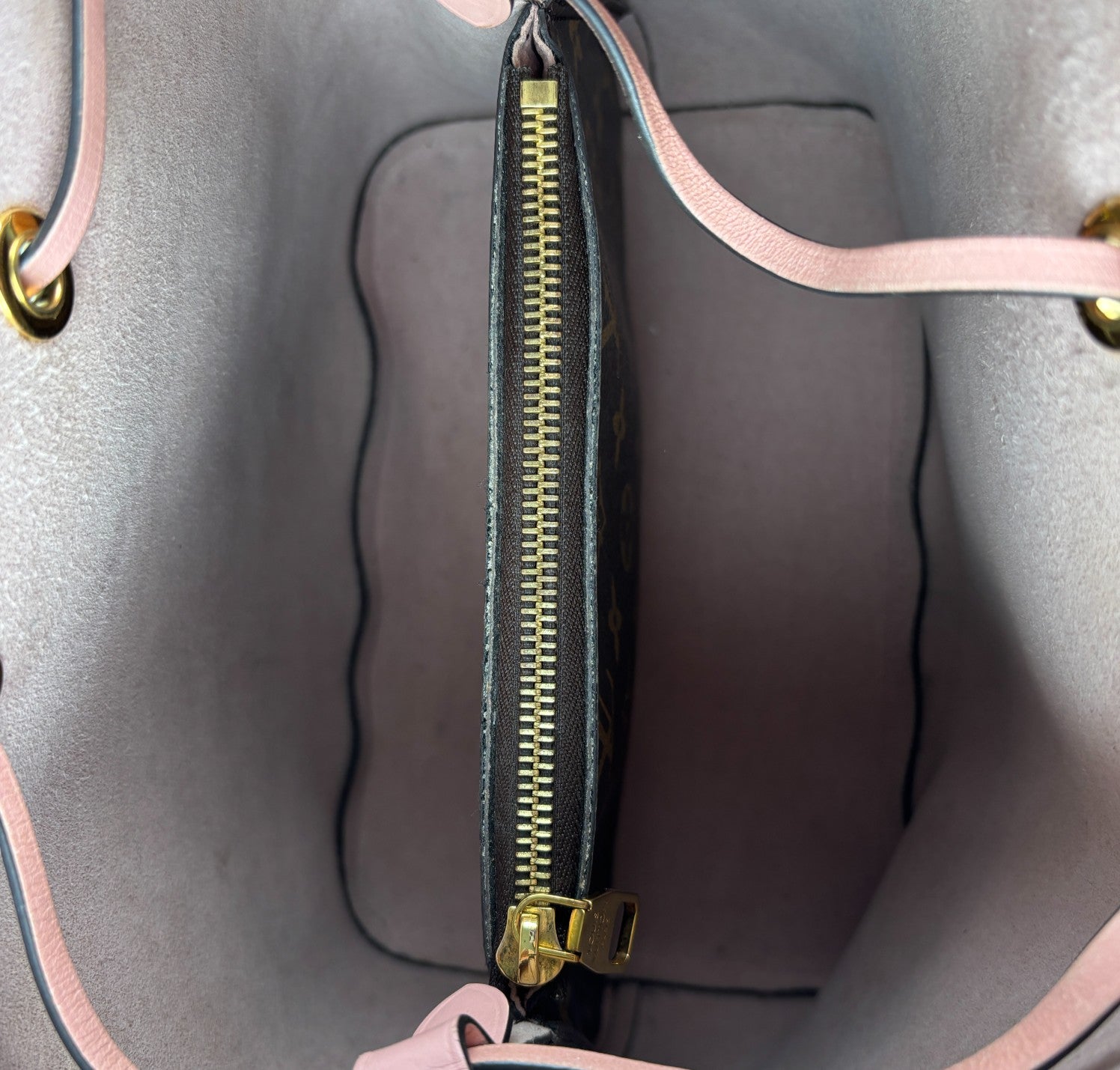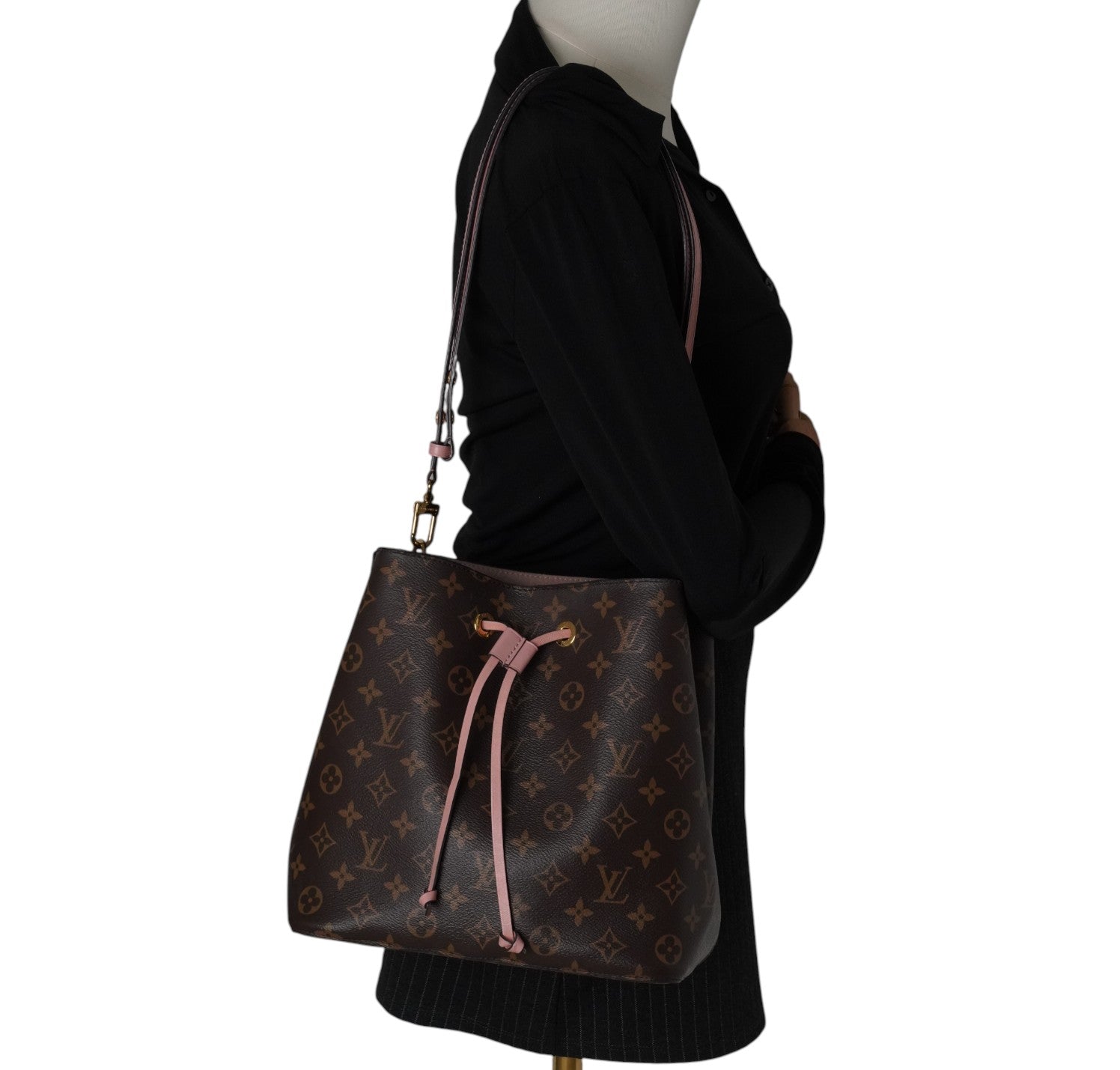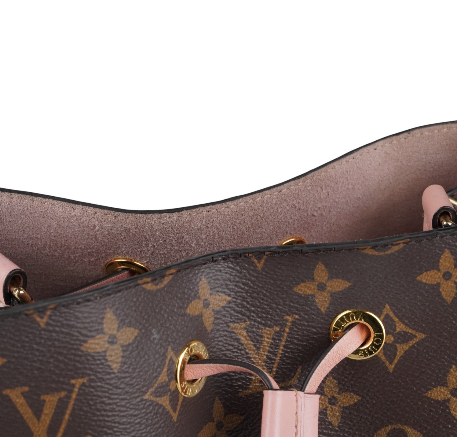 Secchiello Louis Vuitton, modello NéoNoé, realizzato in Tela Monogram. Finiture in Pelle Rosa Rose Poudré. Metalleria in Ottone Dorato. Fodera interna in microfibra Rosa, suddivisa in due scomparti da una tasca centrale piatta con zip. Chiusura superiore con coulisse. Munito di tracolla amovibile e regolabile per personalizzarne l'utilizzo. Si presenta in ottimo stato generale, con lievi segni del tempo in alcuni punti. Minimi micrograffi su tela, pelle. Minimi segni di sfregamento su tessuto interno dovuti al normale utilizzo (parte alta di chiusura).