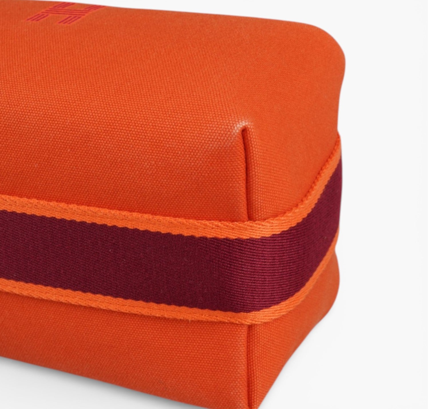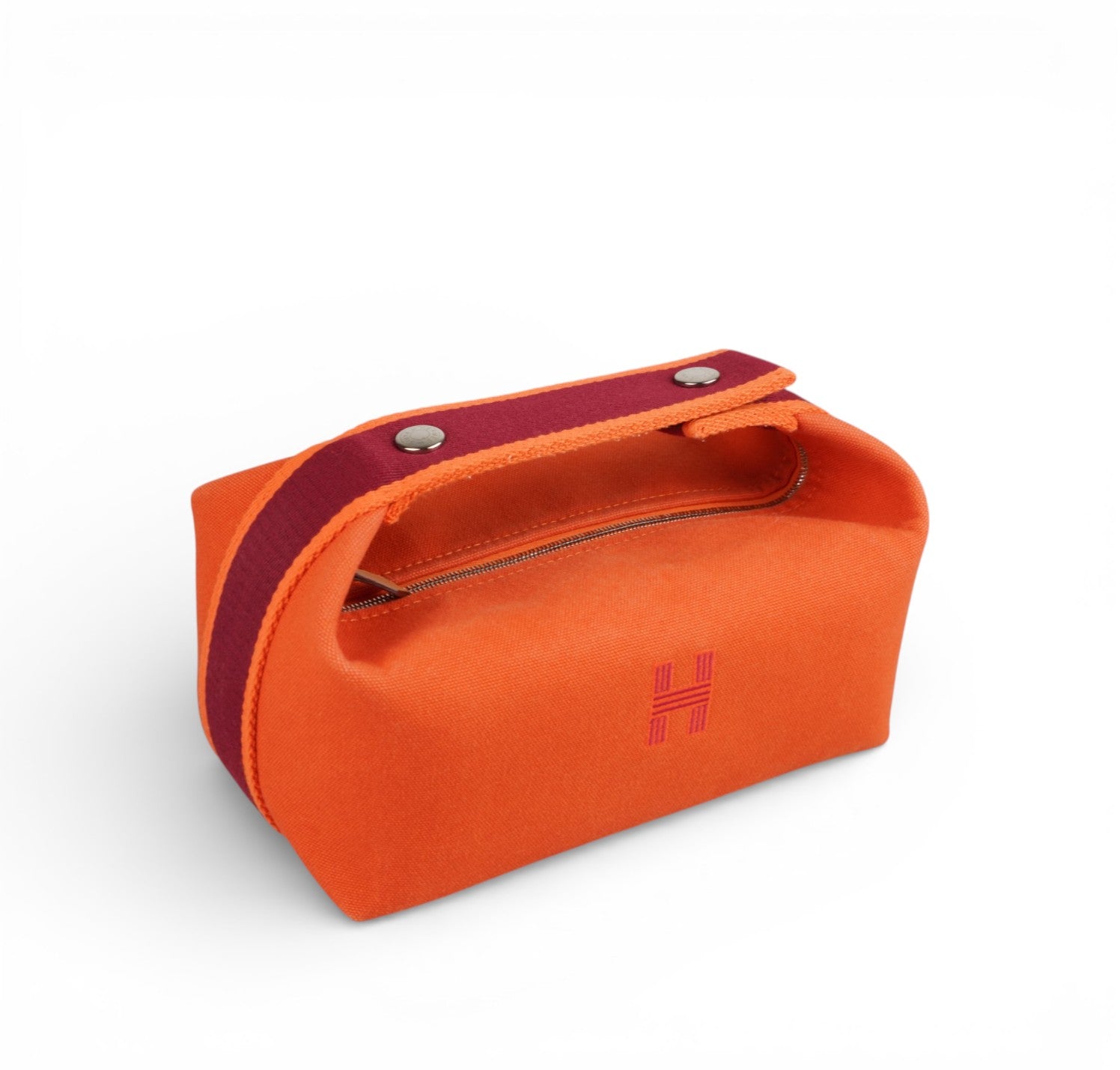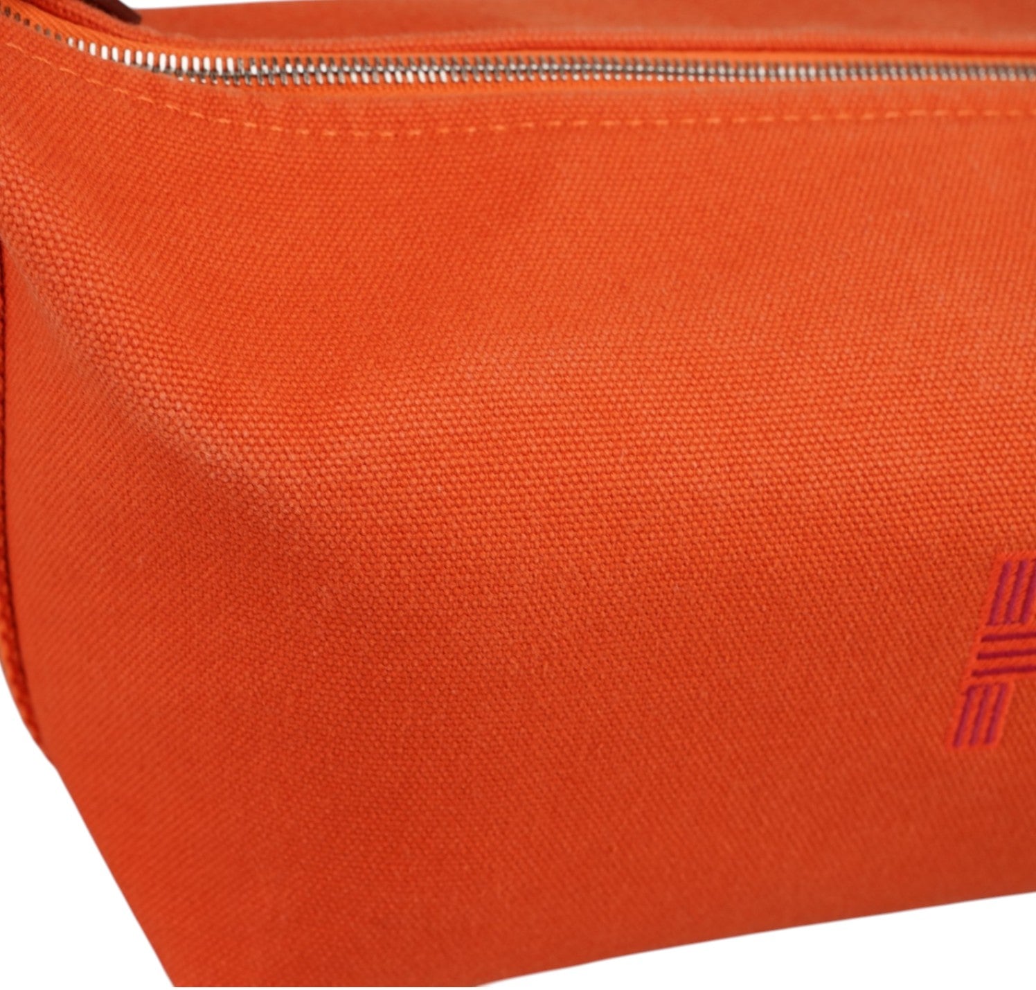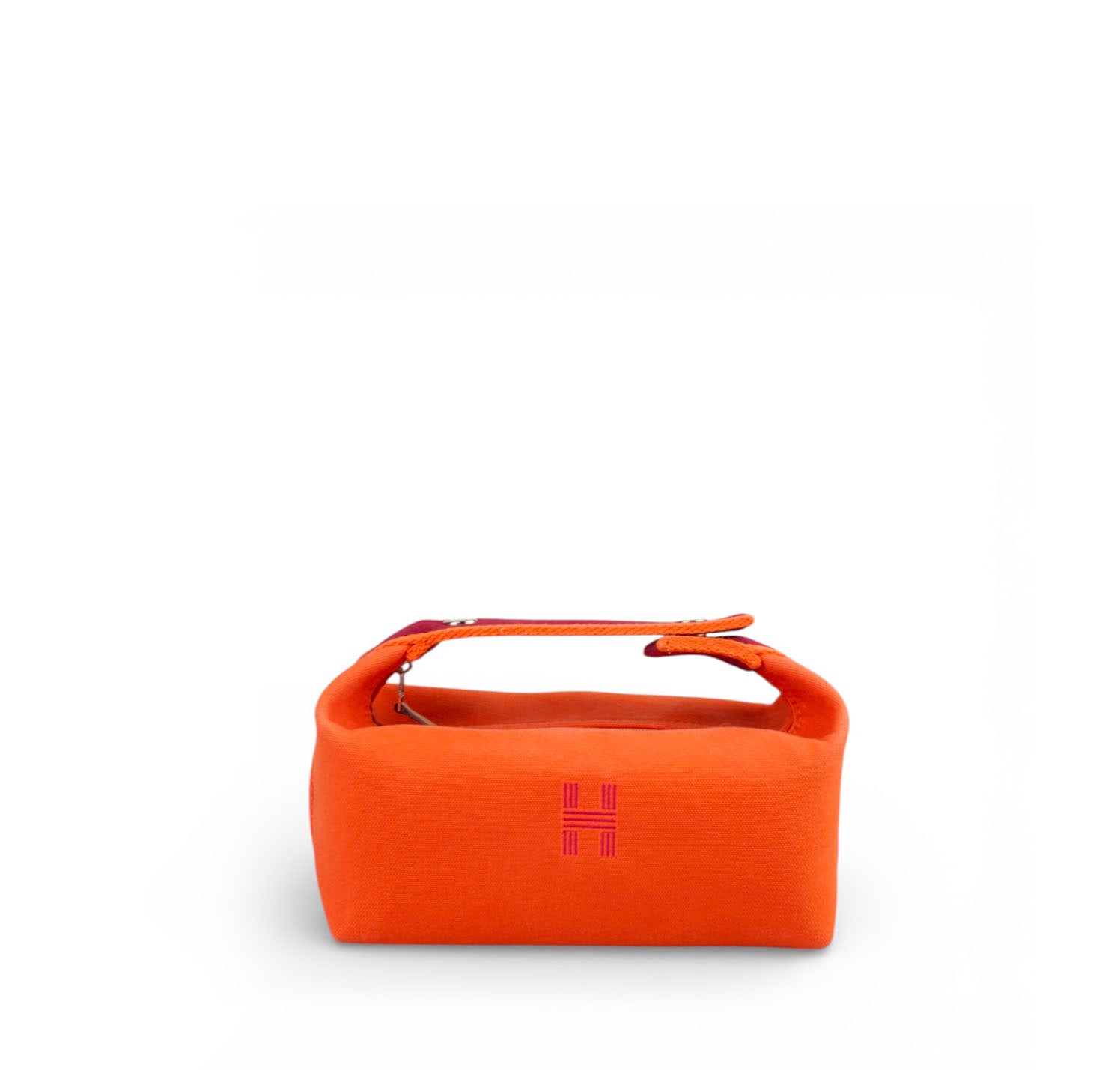 Pochette Hermès, modello Bride-à-Brac, realizzata in tela tonalità Orange Feu con H ricamata sul fronte e dettagli a contrasto nei toni del Prugna. Modello compatto e strutturato con pratico manico superiore in nastro e chiusura con bottone. Apertura superiore con zip, interno in tela con tasca laterale, ideale come beauty o organizer da viaggio. Lievi segni del tempo generali.
