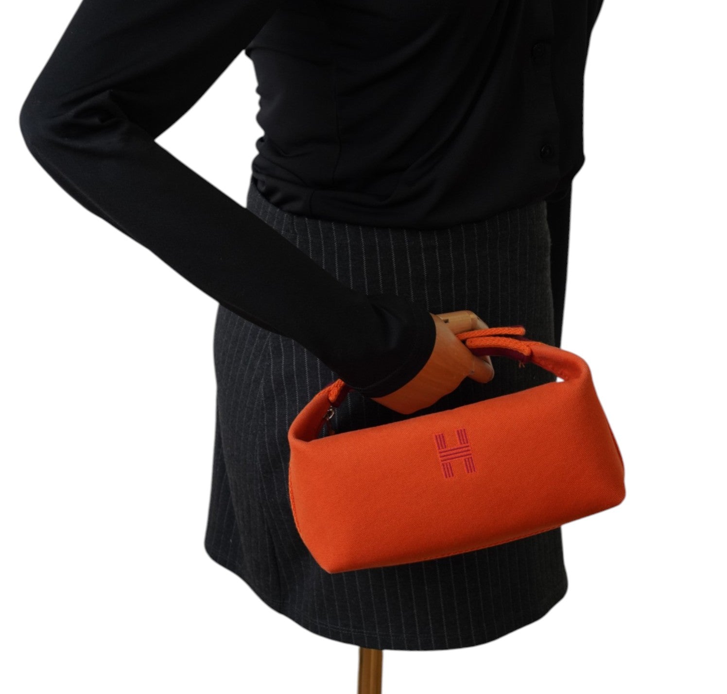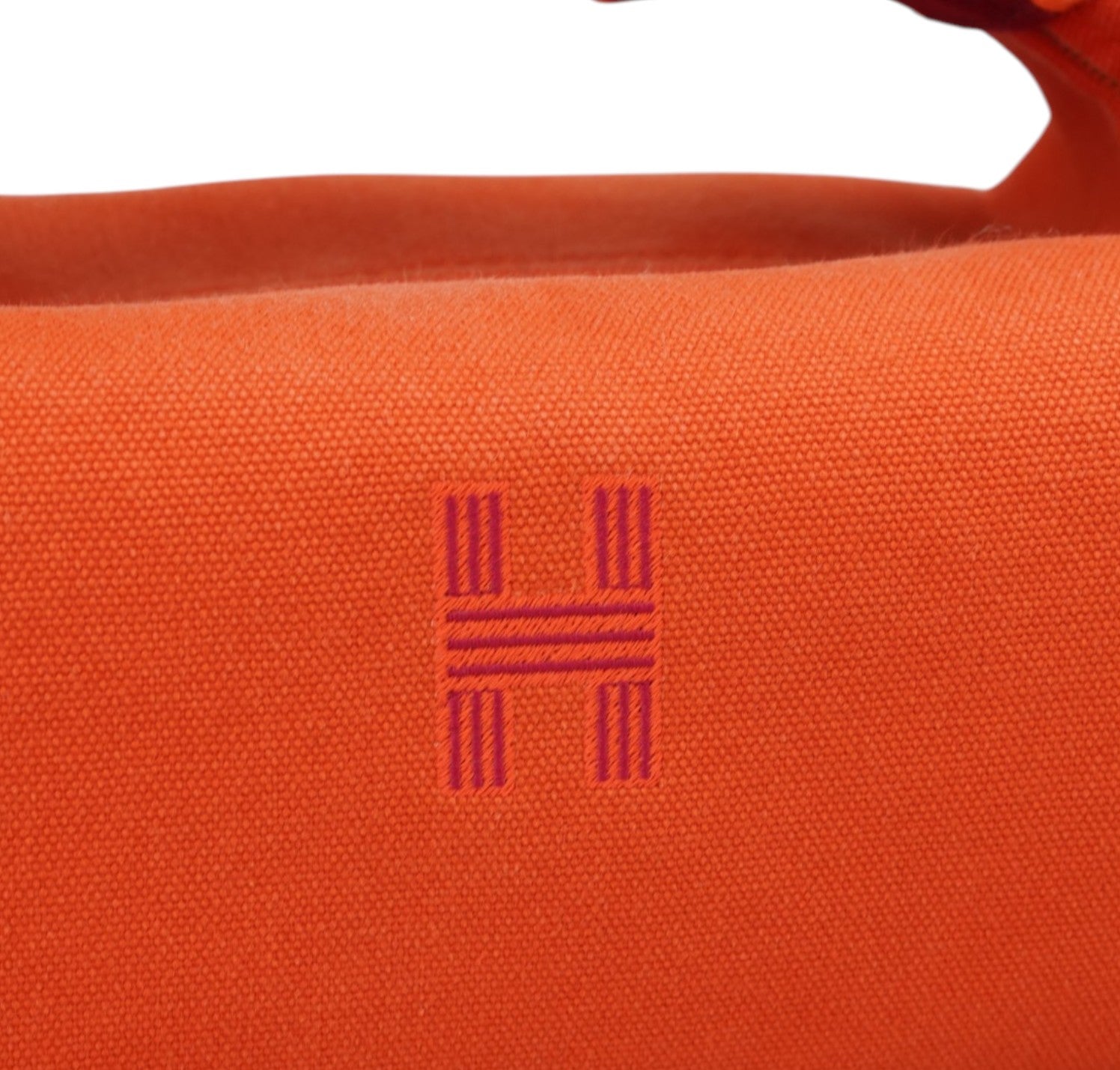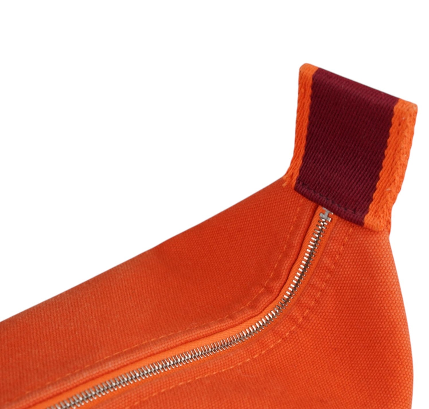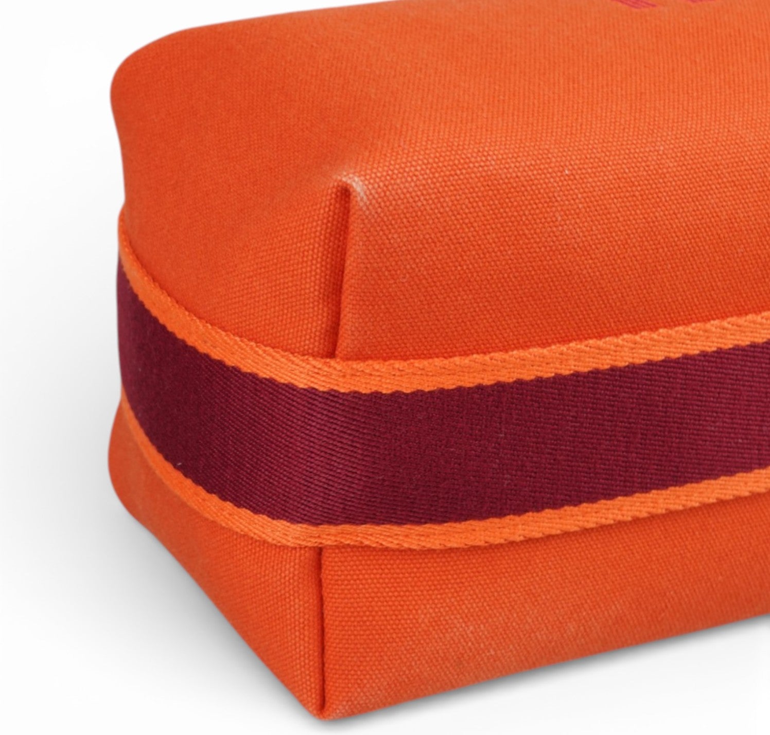 Pochette Hermès, modello Bride-à-Brac, realizzata in tela tonalità Orange Feu con H ricamata sul fronte e dettagli a contrasto nei toni del Prugna. Modello compatto e strutturato con pratico manico superiore in nastro e chiusura con bottone. Apertura superiore con zip, interno in tela con tasca laterale, ideale come beauty o organizer da viaggio. Lievi segni del tempo generali.