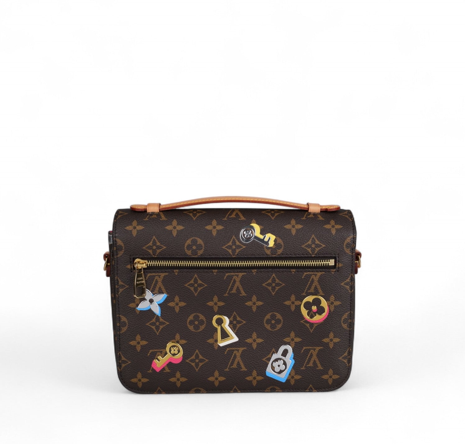 Borsa Louis Vuitton, modello Pochette Métis Monogram Lovelock, Edizione limitata realizzata in Tela Monogram arricchita da un'esclusiva stampa con serrature, chiavi e cuori dai colori vivaci. Un modello compatto ma capiente, dotato di chiusura a S-lock in metallo dorato e interno foderato in microfibra fucsia. Completa di tracolla regolabile, può essere portata a spalla o crossbody. Condizioni generali ottime. È presente un segno d’uso evidente sul lato del canvas (visibile in foto), riparabile tramite la boutique ufficiale. Il prezzo tiene conto di questo dettaglio, lasciando l'opzione di restauro o la possibilità di indossarla così com'è, ad un prezzo vantaggioso.