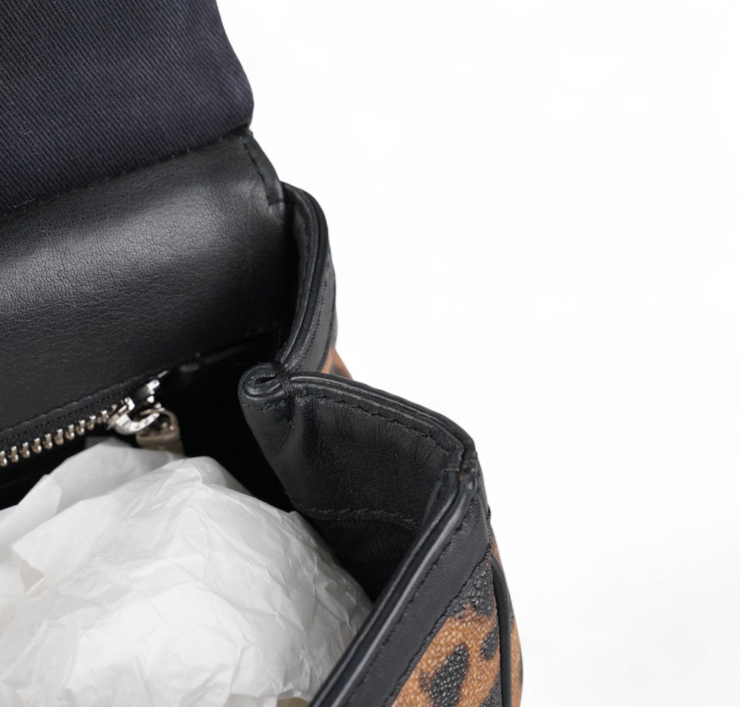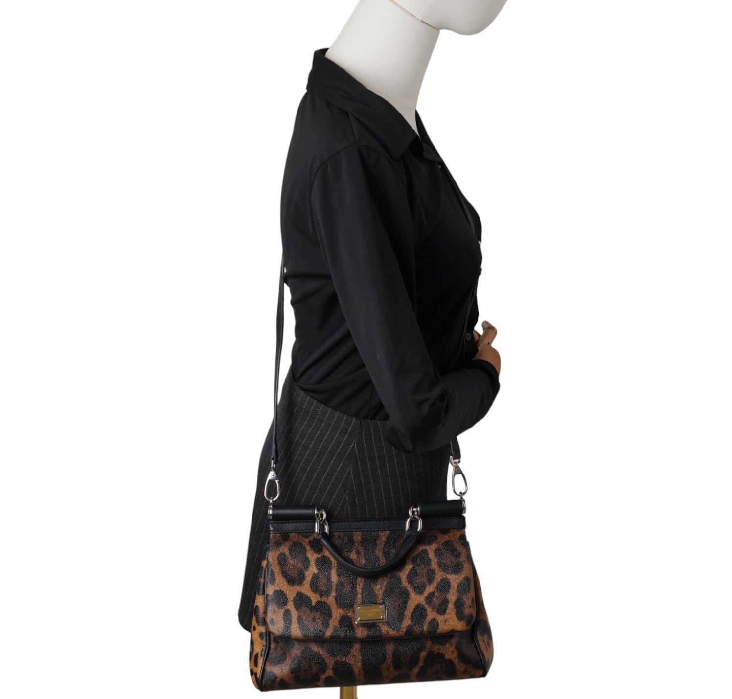 Borsa Dolce&Gabbana, modello Sicily, realizzata in Tela con Stampa Animalier. Finiture in Pelle Nera. Parti metalliche color Argento. Patta frontale con chiusura doppio magnete nascosto, impreziosita da targhetta logata bigalvanica. Fodera interna tessuto Nero, tasca con zip, taschini. Manico On Top per il trasporto a mano e tracolla amovibile e regolabile per il trasporto a spalla o crossbody. Lievi segni d'uso e graffi su metalleria, pelle, generali.