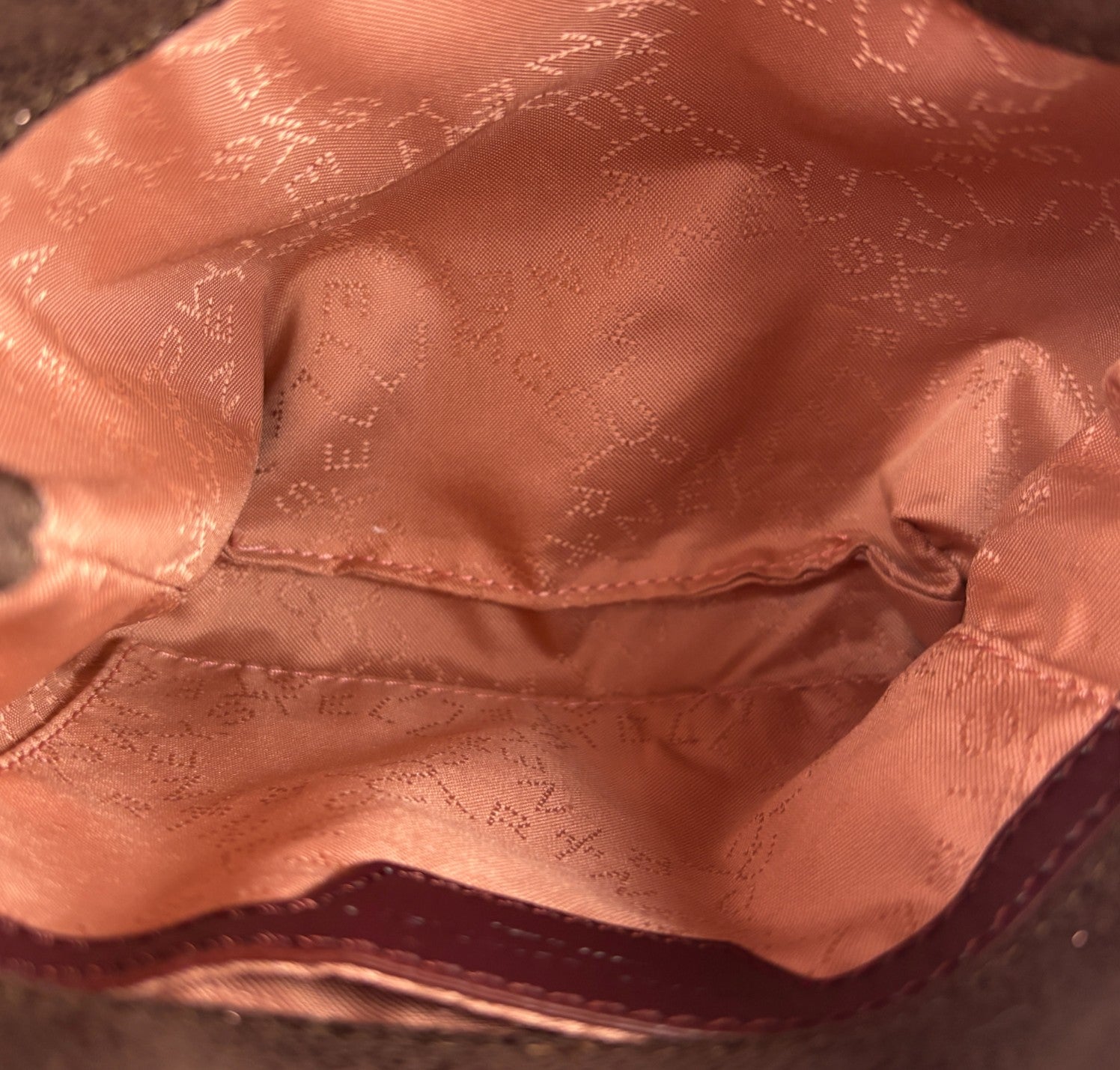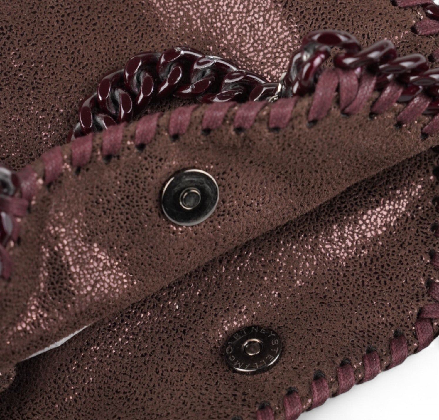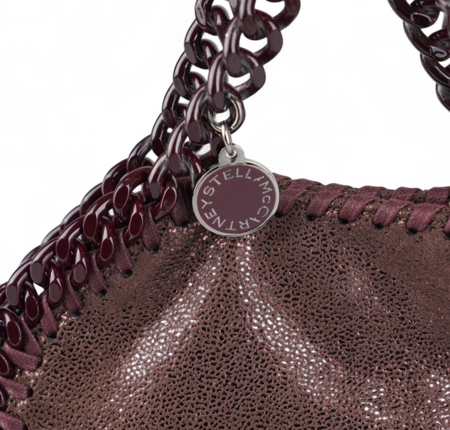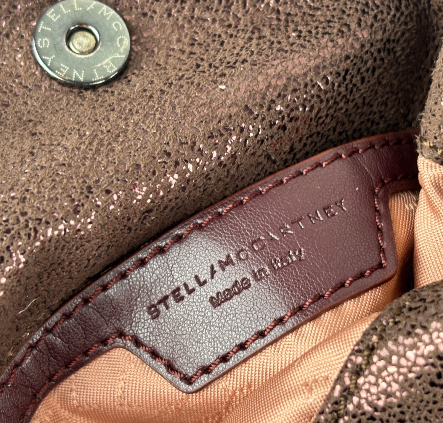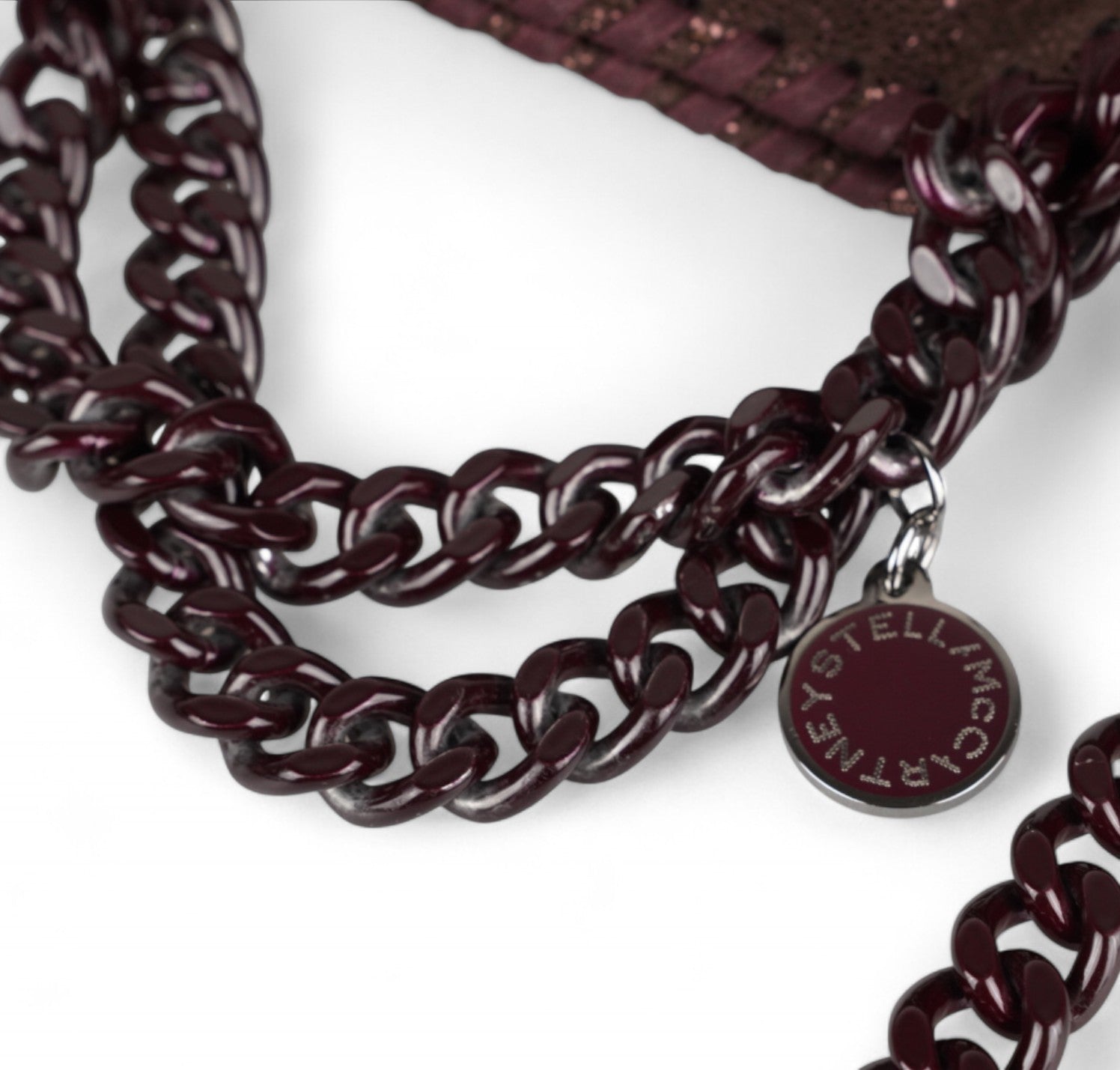 Borsa Stella McCartney, modello Falabella, misura Micro, realizzata in tessuto effetto metallizzato nei toni del Marrone con riflessi luminosi Viola. Rifinita con catena e profili in resina tono prugna/melanzana. Dotata di doppio manico e tracolla per portabilità a mano o bandoliera. Logo inciso su medaglietta pendente. Interno foderato in tessuto. In ottime condizioni generali, lievi segni di sfregamento sulla catena dei manici coerenti con normale utilizzo. Minimi segni del tempo.