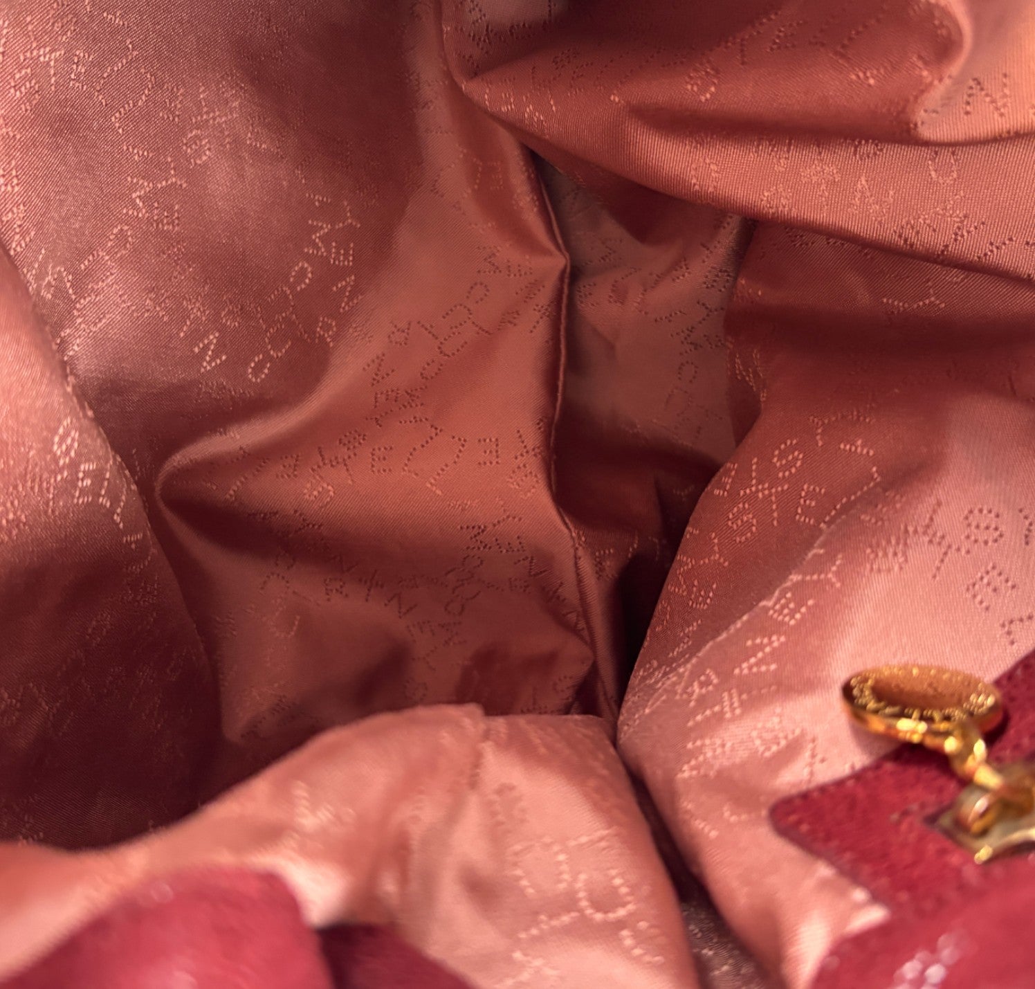 Borsa pieghevole Tote Falabella by Stella McCartney. Realizzata in Tessuto Vegano Bordeaux (Melograno) Shaggy Deer. Dettagli metallici intrecciati color Oro. Interno capiente, realizzato in poliestere riciclato Rosa logato, tasca a bustina. Chiusura superiore magnetica con bottone. Dotata di tracolla corta per il trasporto a spalla, manici superiori per il trasporto a mano. Minimi segni d'uso su hardware, lievi segni d'uso generali.
