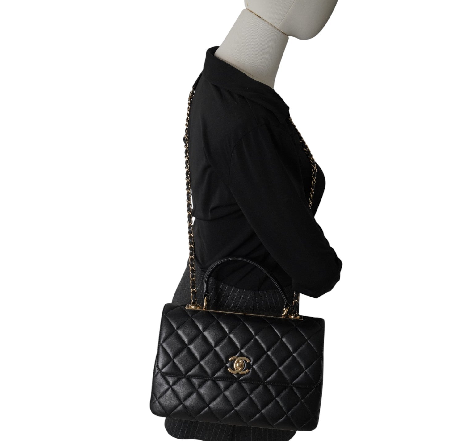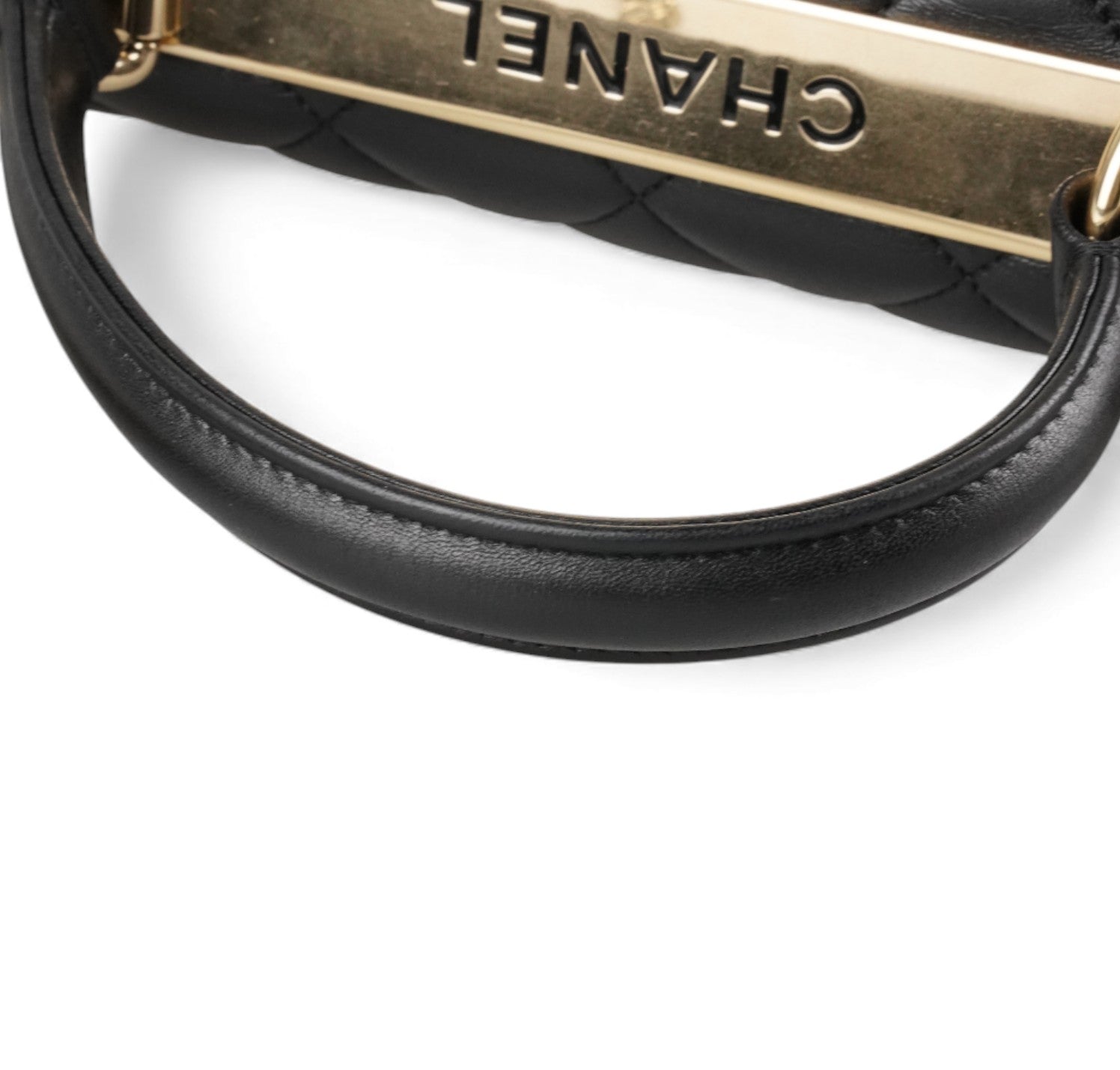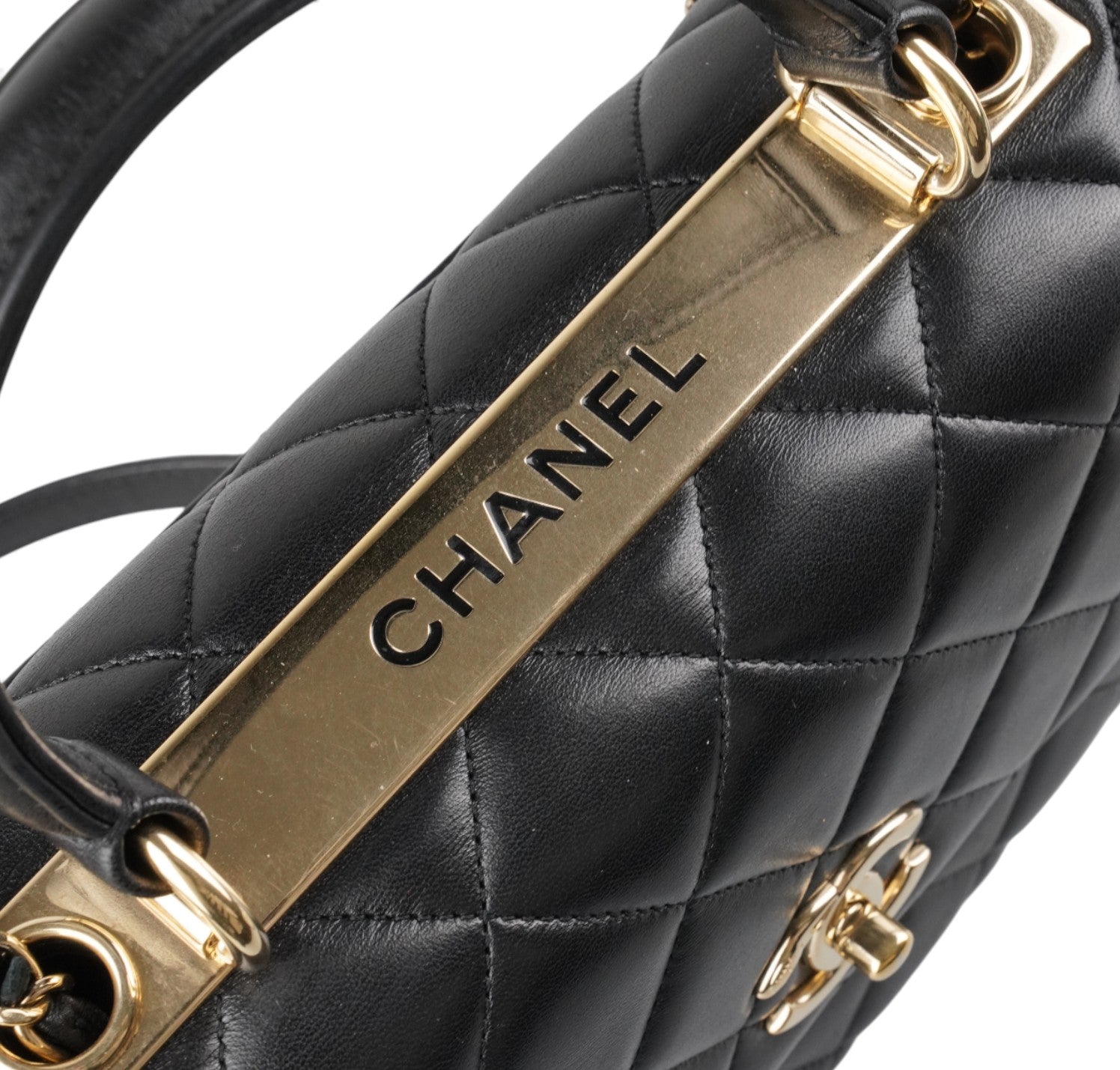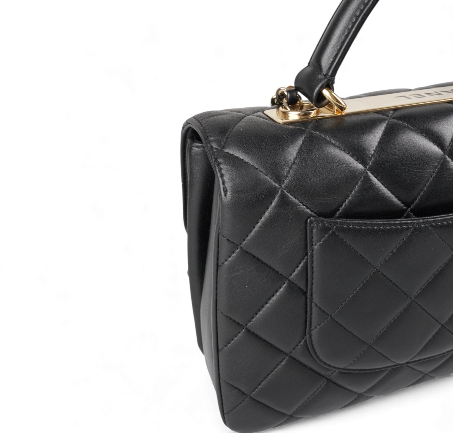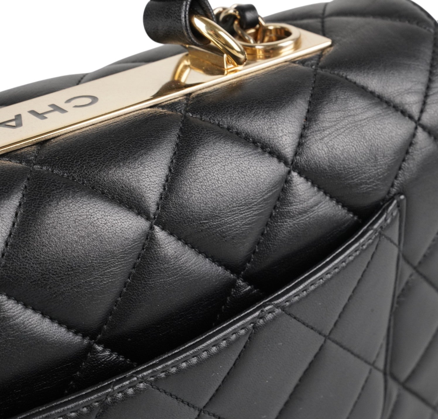 Borsa Chanel, modello Trendy CC, realizzata in Pelle Nera. Finiture in metallo dorato. Metalleria con placca superiore incisa. Chiusura con patta anteriore e turn-lock CC. Interno foderato in pelle bordeaux, suddiviso in scomparti. Munita di manico superiore rigido e tracolla in pelle con catena. Priva di sticker interno ma munita di card. Presenta minimi segni di pressione sotto la patta e lievi graffi generali. Minimi segni metalleria.