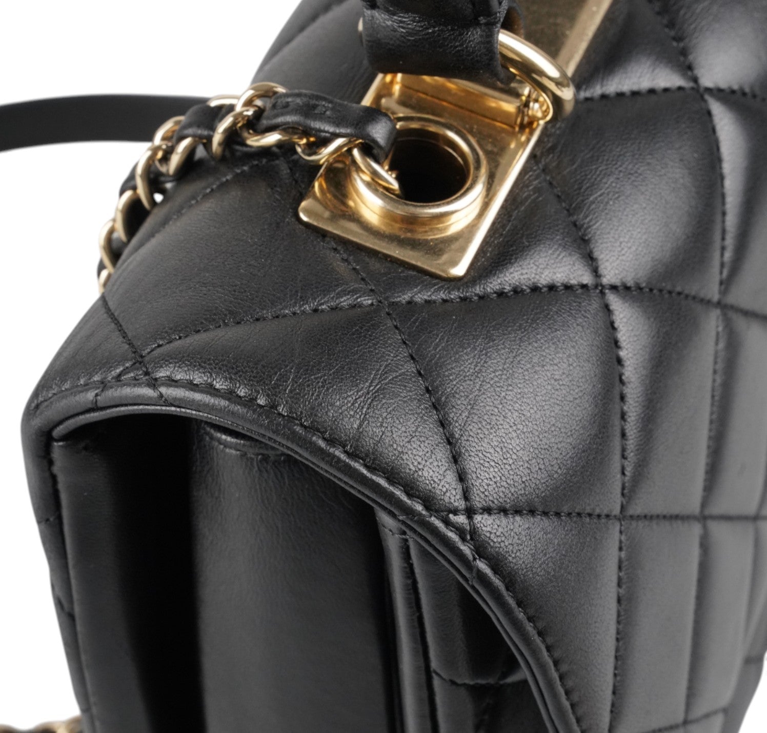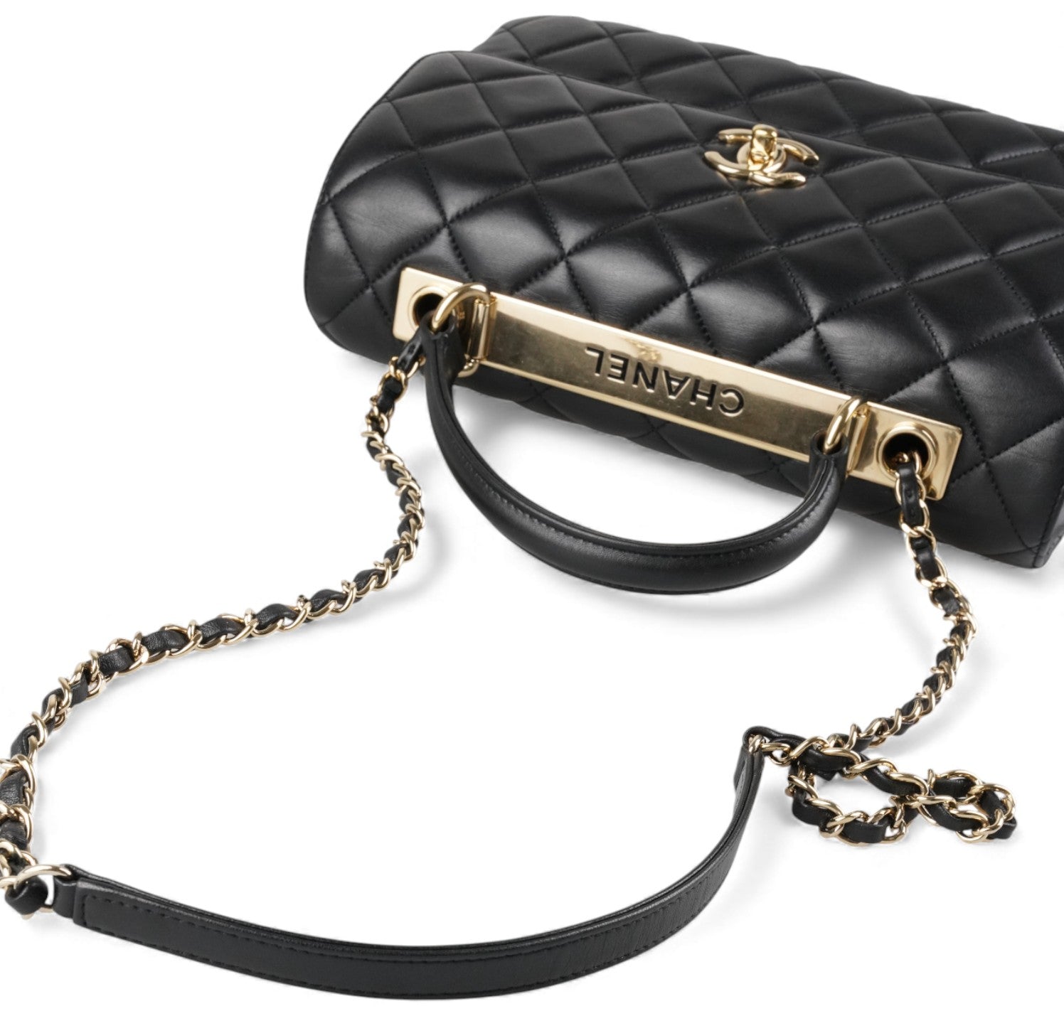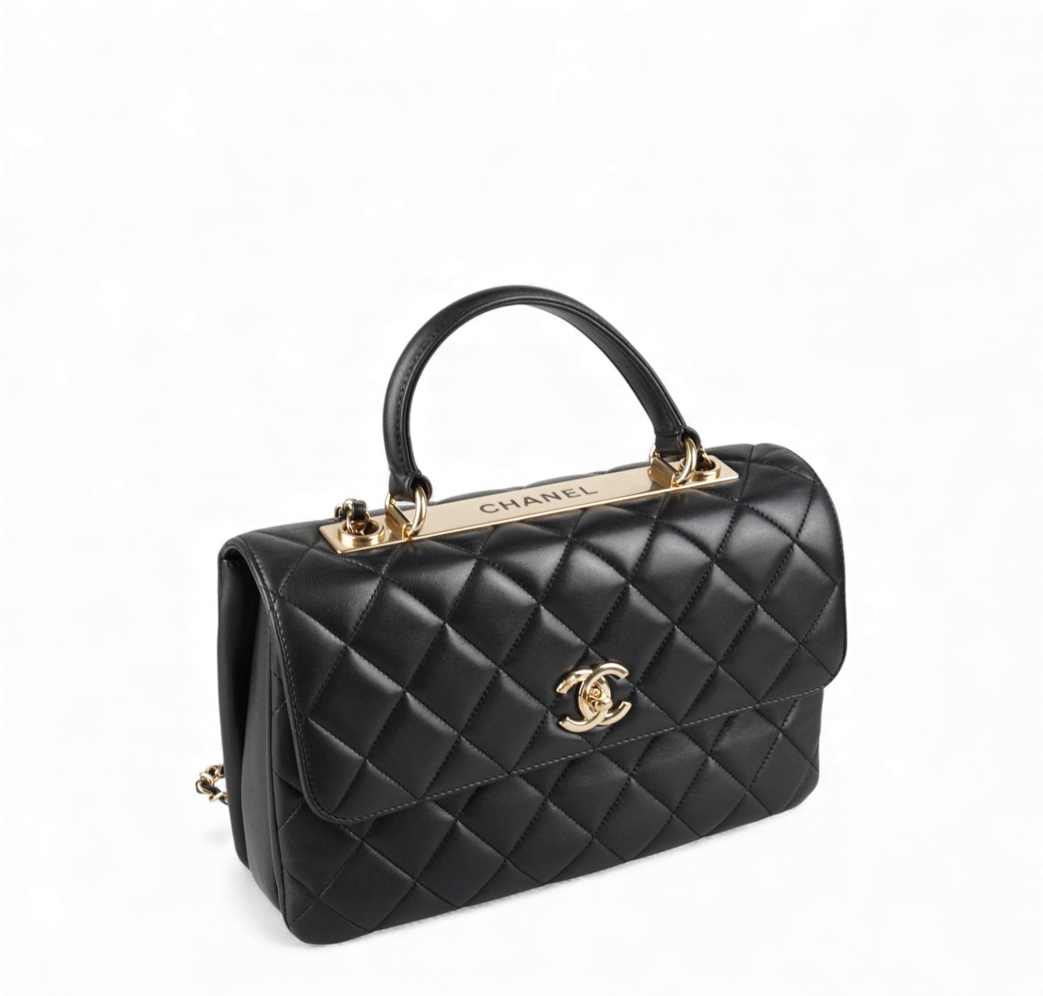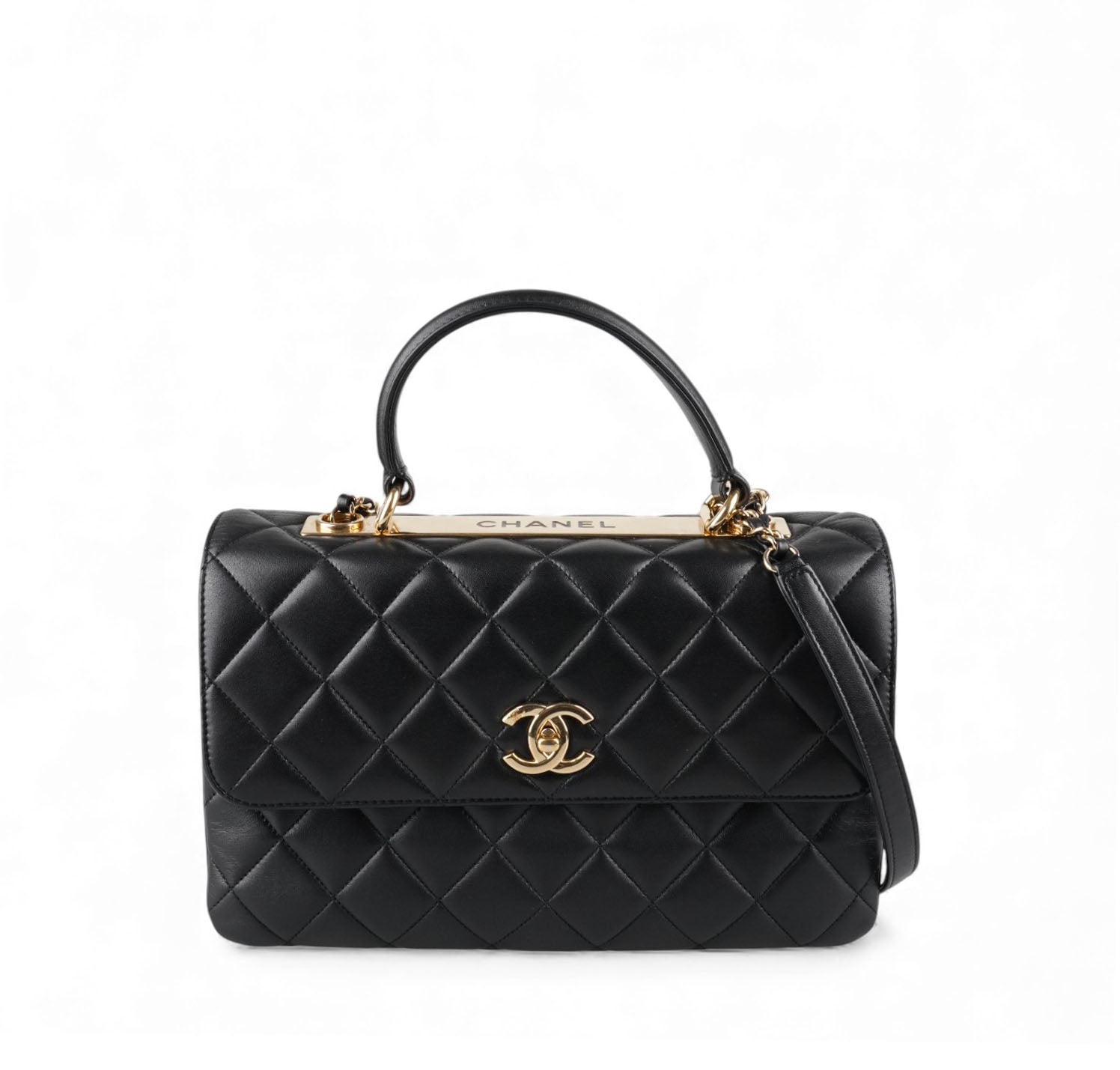 Borsa Chanel, modello Trendy CC, realizzata in Pelle Nera. Finiture in metallo dorato. Metalleria con placca superiore incisa. Chiusura con patta anteriore e turn-lock CC. Interno foderato in pelle bordeaux, suddiviso in scomparti. Munita di manico superiore rigido e tracolla in pelle con catena. Priva di sticker interno ma munita di card. Presenta minimi segni di pressione sotto la patta e lievi graffi generali. Minimi segni metalleria.